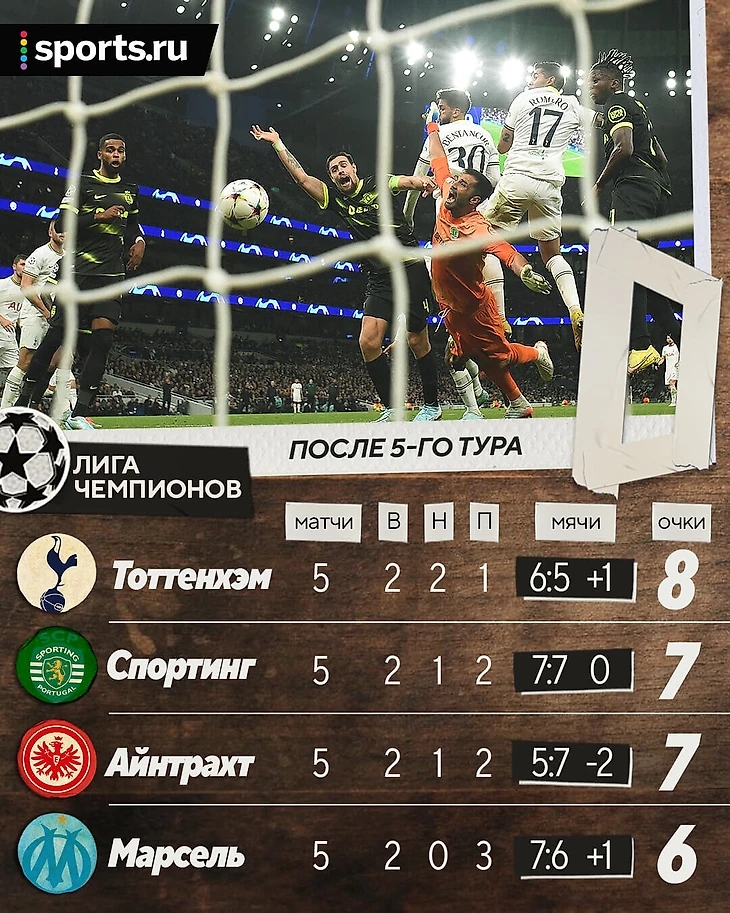 🇵🇹 «Спортинг»: выведет победа или ничья дома с «Айнтрахтом». Для выхода с первого места нужна победа над «Айнтрахтом» и непобеда «Тоттенхэма» с «Марселем». В Лигу Европы (то есть на третье место) португальцы свалятся, если и они, и «Марсель» проиграют свои матчи.