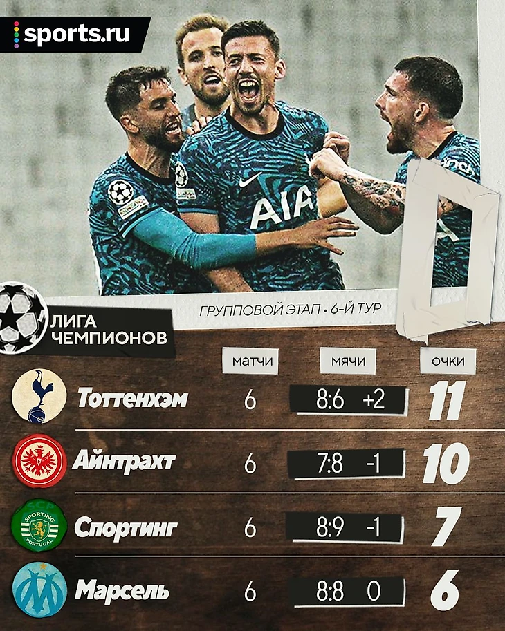 Положение в группе: «Тоттенхэм» (9 очков в режиме лайв), «Спортинг» (8), «Айнтрахт» (8), «Марсель» (7)