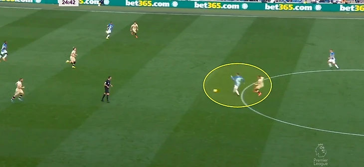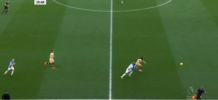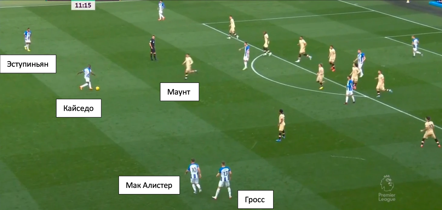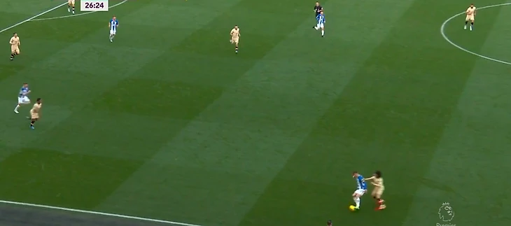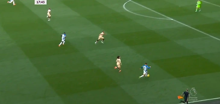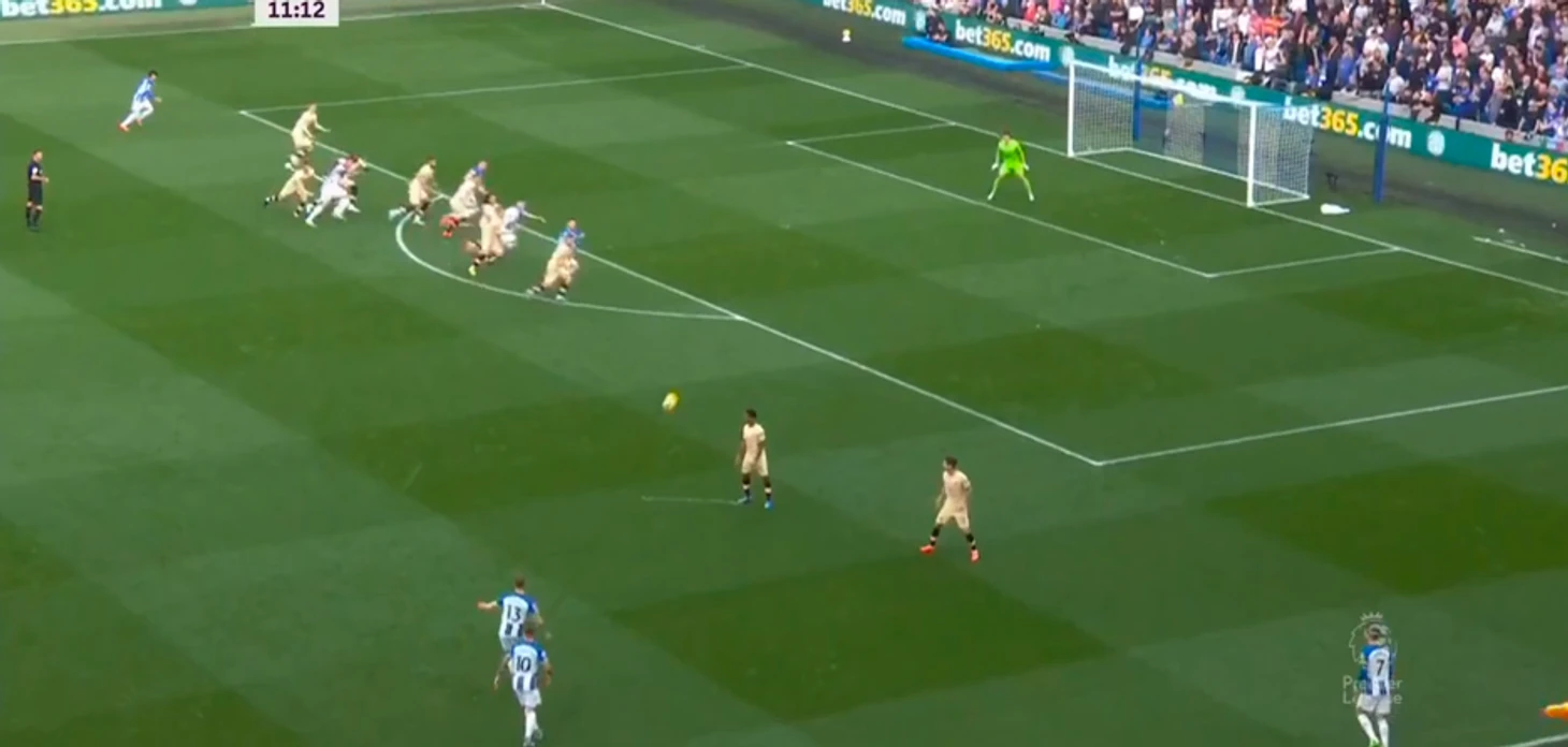 - 3 игроков против 3 игроков Брайтона, которые бегут с разной траекторией (именно за одним из них не успели уследить при первой попытке взятия ворот)