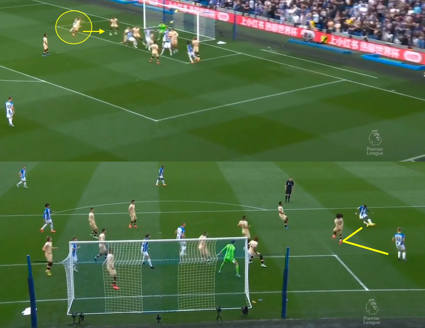 Еще один момент в конце первого тайма. 3 игрока Брайтона готовы к отскоку, расстояние от ближайшего обороняющегося минимум 10 метров.