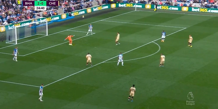 И этот стандарт использовался командой Де Дзерби, 5 игроков Брайтона были готовы идти в высокий прессинг при коротком розыгрыше, а более высокие игроки Брайтона ожидали верховой борьбы против Хаверца, Стерлинга и Пулишича.