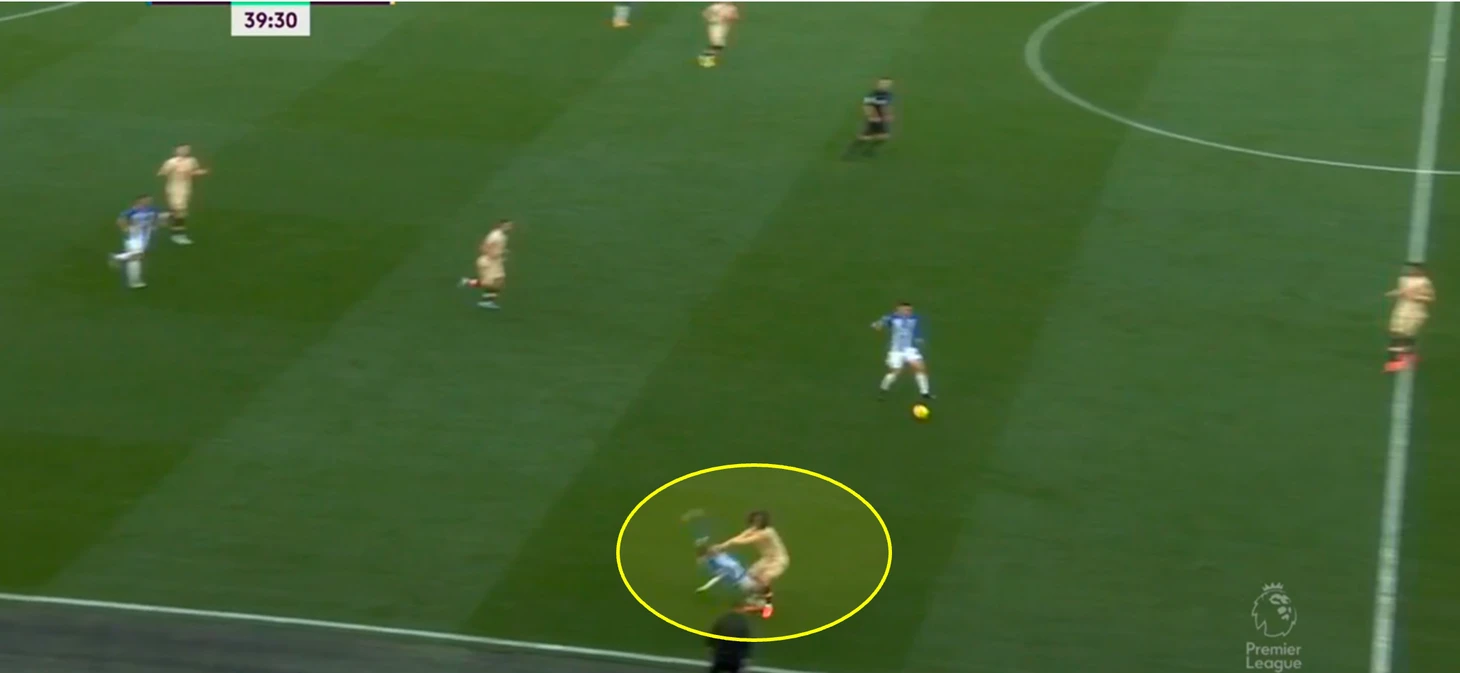 Одним из главных игроков при обострении у ворот Челси был правый фланг, где Кукурелья (правый цз) должен был весь первый тайм в одиночку противостоять Соломону Марчу без поддержки и подстраховки со стороны Стерлинга. Время специально оставил.