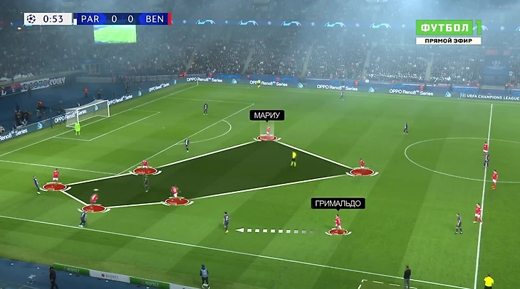 Такое ультракомпактное расположение – постоянная особенность прессинга «Бенфики». Кажется, Шмидт просит, чтобы вингер располагался четко по центру, чтобы иметь возможность читать эпизод – либо замыкать прессинг, либо возвращаться в случае перехода: