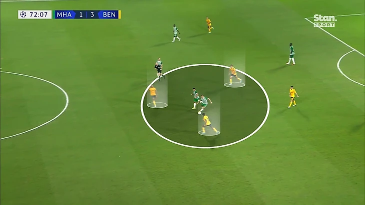 Но есть бонусный фактор. Из-за особенностей прессинга «Бенфики» чаще возникают ситуации, когда после отбора у команды на ограниченном участке поля собрано много игроков, что дает больше вариантов для продолжения и потенциал для комбинаций: