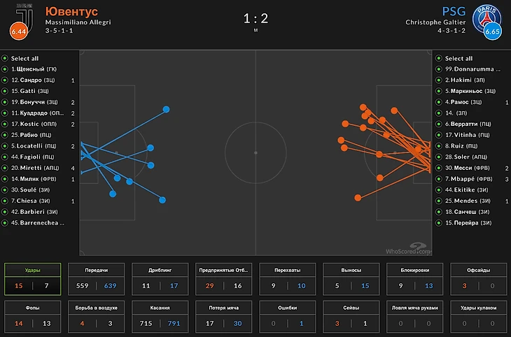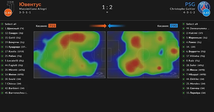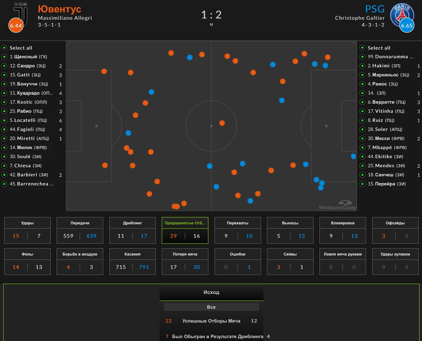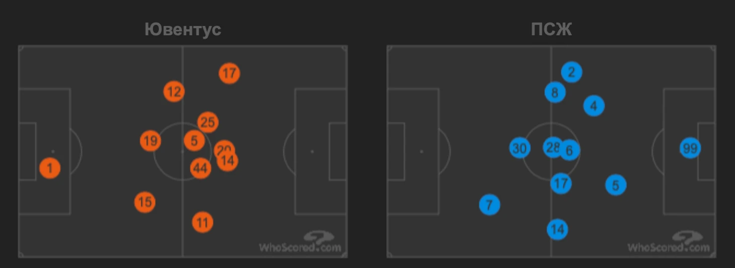 И самый положительный момент матча - физические кондиции футболистов Ювентуса, которые воплотились в доминирование при прессинге. В общей сложности туринцы предприняли 29 попыток отбора при 22 успешных. ПСЖ решился лишь на 16 попыток при 12 удачах. Парижане 30 раз теряли мяч по всей ширине поля, при этом ровно в половине случаев эта потеря сопровождалась давлением соперника, и 15 раз - брак в передачах. У Ювентуса этот показатель в два раза ниже - 17 потерь при 8 раз от давления соперника.