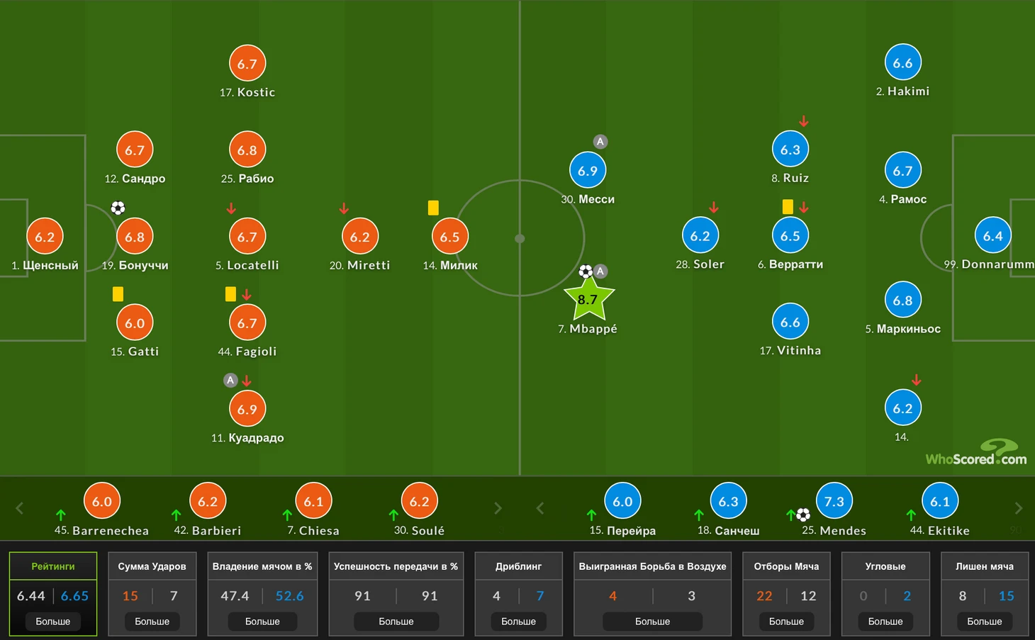 Разумеется, лучшим на поле стал Мбаппе. Остальные футболисты были будто из другой спортивной лиги и играли в другой футбол. У Ювентуса в числе лидеров можно смело отметить Хуана Куадрадо, который будто вспомнил молодость и начал исправляться за ошибки старта сезона, Николо Фаджоли с его шикарным умением разрушать построение соперника и работать без мяча, а также Андрена Рабьо, в очередной раз задавившего физикой Марко Верратти.