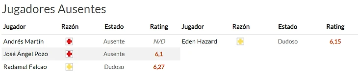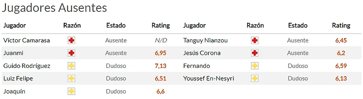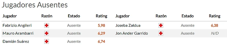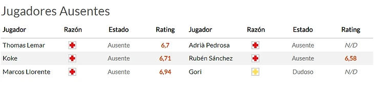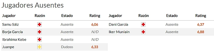 Сегодня ребята из Бильбао постараются упрочить свой отрыв в этой специфической дисциплине, однако в этом им не смогут помочь два пожалуй что самых умелых полузащитника клуба - травмированные Муниаин(8) и Андер Эррера(7). Что касается хозяев, то точно не выйдет на поле травмированный Хуанпе(5) и вероятнее пропустит матч приболевший Ян Коуту(5).