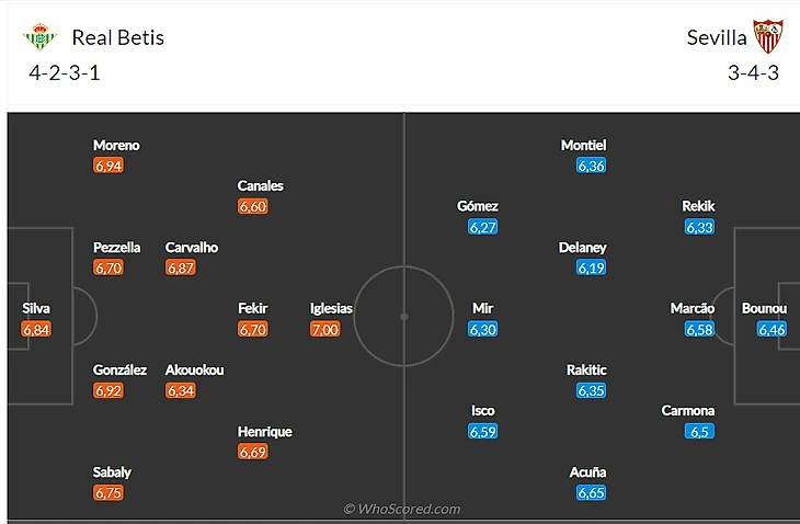 Но до этого ещё месяц, а в суровом настоящем не смогут помочь хозяевам в Дерби Севильяно травмированные Луис Фелипе (5,5) и несравненный Хоакин(6,5). Впрочем гости тоже приедут на Бенито Вильямаррин не в оптимальном составе. Иско(7,5) - перебрал карточек, многострадальный Маркао(6) опять загремел в лазарет и снова сыграет за андалусийцев уже после чемпионата Мира. Плюс до сих поре неизвестно успеют ли клубные врачи отшаманить Фернандо(6), Торреса(7) или Ньянзу(5.5).