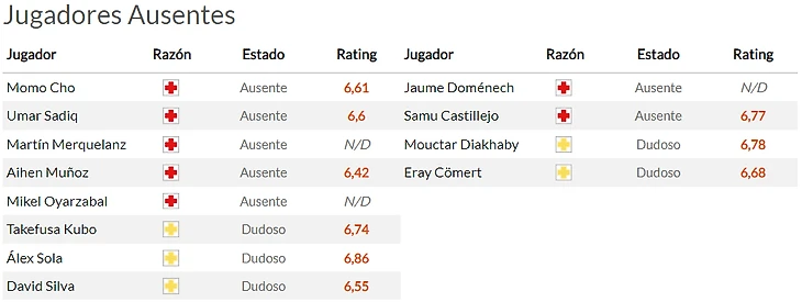 Гости из Осасуны пока ничего на тренерском мостике менять не намерены и Хакобе Аррасате по прежнему предстоит управлять клубом из Наварры. Который лишился в этом туре основного кипера Эрреры(5,5) и возможно не сможет рассчитывать на только поправившегося Круса(5).