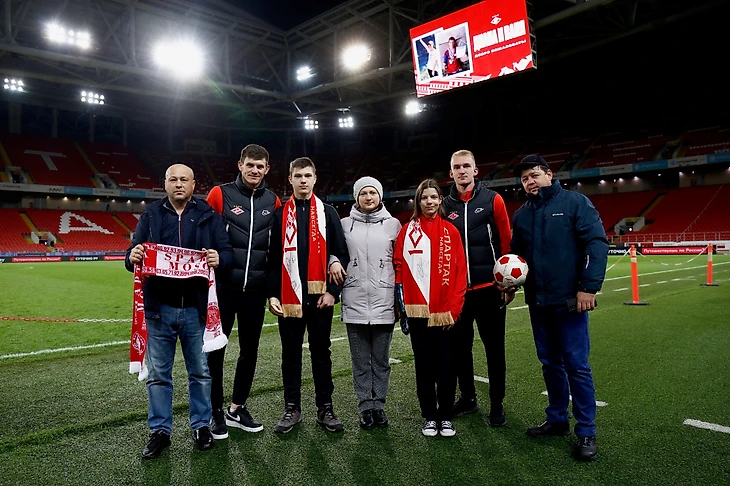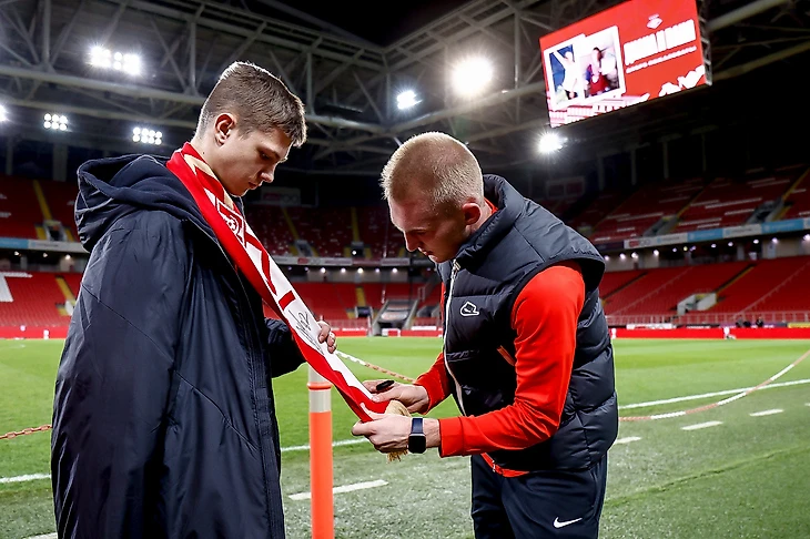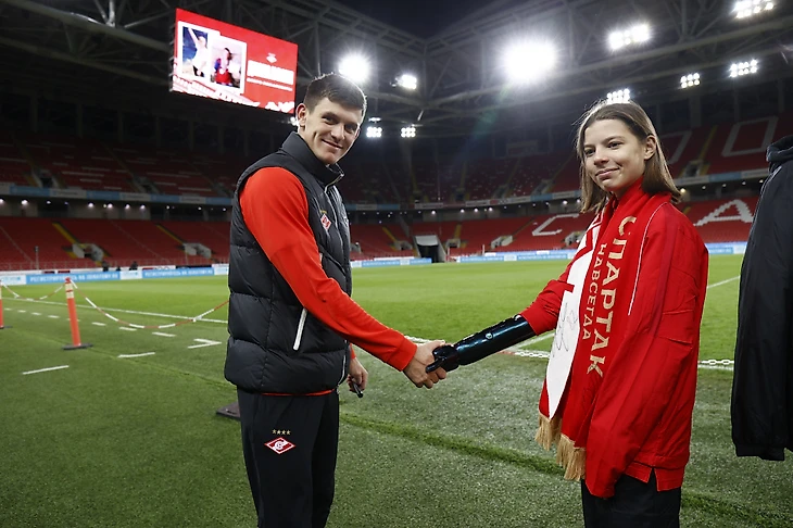Дорогих гостей приветствовали полузащитники красно-белых Даниил Хлусевич и лучший футболист встречи Даниил Денисов. Парни преподнесли в подарок Диане и Ване шарфы с личными автографами, душевно пообщались в неформальной обстановке и, конечно, сфотографировались на память. Ну а главным сюрпризом для юного футболиста Вани стало исполнение еще одной маленькой мечты — поиграть в мяч со спартаковцами на кромке поля.