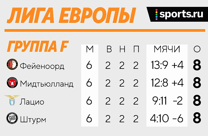Так «Фейеноорд» и «Мидтьюлланд» тоже набрали по 8 очков и залетели в плей-офф ЛЕ – все благодаря лучшей разнице мячей (голландцы впереди, потому что больше забили).