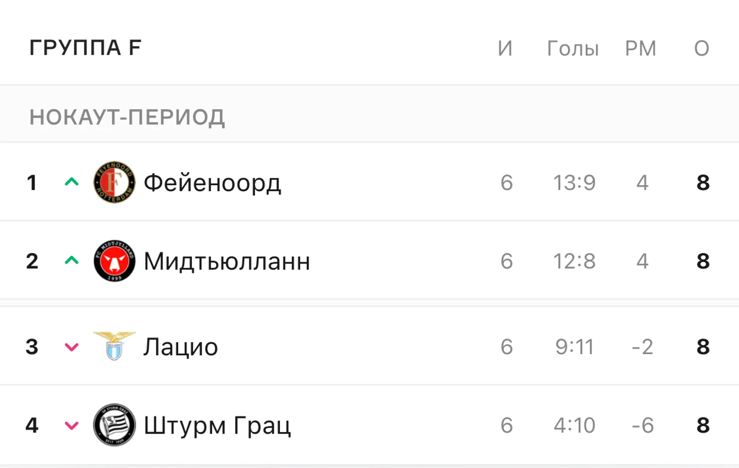 Прямо сейчас завершается групповой этап еврокубков, и в группе F Лиги Европы произошла интересная ситуация: все четыре команды набрали по 8 очков. Лацио, Штурм, Фейеноорд и Мидтьюлланн проиграли, выиграли и сыграли вничью по 2 матча. В итоге, участников следующей стадии турнира определяли по разнице забитых и пропущенных мячей, которая оказалась лучше всего у Фейеноорда и Мидтьюллана, но даже тут у двух команд получилось равенство! Поэтому победителя группы определяли по забитым голам, где лучше оказались нидерландцы.