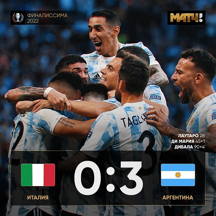 Третий Кубок Артемио Франки или первая Финалиссима, которая состоялась 1 июня 2022 г. Любопытный факт: 1 июня 2012 г. Италия-Россия 0:3; 1 июня 2022 г. Италия-Аргентина 0:3. 1 июня, раз в 10 лет, Италия проигрывает со счётом 0:3. Сборная Аргентины имела за все 90 минут игры полное превосходство над сборной Италии. Джорджо Кьеллини сыграл свой последний матч за сборную Италии. Лионель Месси выиграл второй трофей на уровне сборных (после победы Аргентины на Кубке Америки - 2021). Италия: [21, В] Джанлуиджи Доннарумма, [3, З] Джорджио Кьеллини ([6, П] Мануэль Лаццари, 46'), [19, З] Леонардо Бонуччи, [13, З] Палмиери Эмерсон ([23, З] Алессандро Бастони, 77'), [2, З] Джованни Ди Лоренцо, [8, П] Жоржиньо, [18, П] Николо Барелла, [12, П] Маттео Пессина ([4, П] Леонардо Спинаццола, 63'), [10, Н] Федерико Бернардески ([5, П] Мануэль Локателли, 46'), [9, Н] Андреа Белотти ([17, Н] Джанлука Скамакка, 46'), [22, Н] Джакомо Распадори. Запасные: [1, В] Алессио Краньо, [14, В] Алекс Мерет, [7, З] Алессандро Флоренци, [15, З] Франческо Ачерби, [16, П] Брайан Кристанте, [29, П] Лоренцо Пеллегрини, [11, П] Маттео Политано. Тренер: Роберто Манчини. Аргентина: [23, В] Эмилиано Мартинес, [19, З] Николас Отаменди, [3, З] Николас Тальяфико, [13, З] Кристиан Ромеро ([6, З] Херман Песселья, 85'), [11, П] Анхель Ди Мария ([15, Н] Николас Гонсалес, 90'), [7, П] Родриго Де Пауль ([14, П] Эксекиэль Паласиос, 75'), [18, П] Гвидо Родригес, [20, П] Джовани Ло Чельсо ([21, Н] Пауло Дибала, 90'), [4, П] Науэль Молина, [10, Н] Лионель Месси, [22, Н] Лаутаро Мартинес ([9, П] Хулиан Альварес, 85'). Запасные: [12, В] Херонимо Рульи, [1, В] Франко Армани, [16, З] Лисандро Мартинес, [2, З] Хуан Фойт, [8, П] Маркос Акунья, [5, П] Алексис Макалистер, [17, Н] Алехандро Гомес. Тренер: Лионель Скалони. Голы: Лаутаро Мартинес, 28' - 0:1; Анхель Ди Мария, 45' - 0:2; Пауло Дибала, 90' - 0:3. Предупреждены: Леонардо Бонуччи, 39', Джованни Ди Лоренцо, 72', Николо Барелла, 77' - Италия; Николас Отаменди, 22' - Аргентина. Судья: Гомес Пьеро (Чили); Судья на линии 1: Ортис Клаудио (Чили); Судья на линии 2: Шиманн Кристиан (Чили); Резервный судья: Хиль Мансано Хесус (Испания). 1 июня 2022 г. Стадион «Уэмбли» (Лондон).