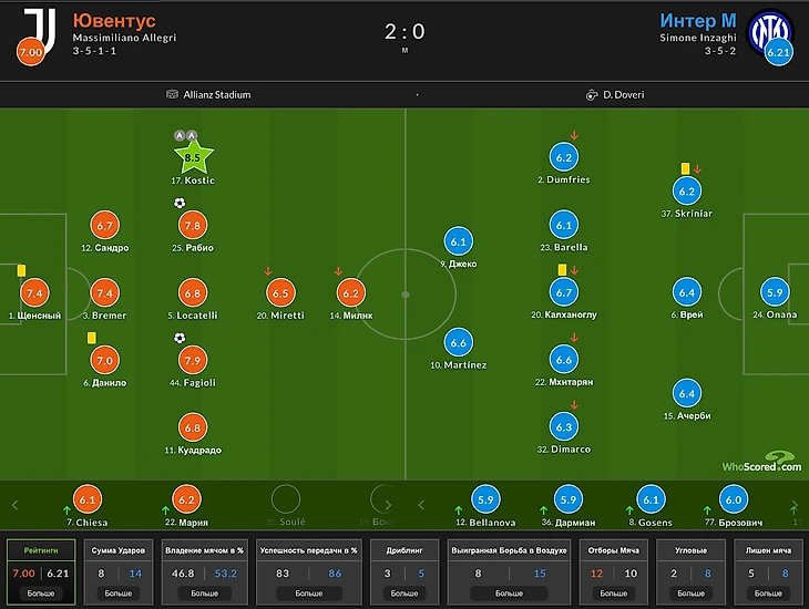 По игрокам рассуждать сложно, поскольку вся команда отыграла неровно, но эффективно. Лучшим, пожалуй, стоит назвать Филипа Костича, который целиком и полностью ответственен за итоговый результат. Пусть судья не позволил ему записать на свой счет ассистентский хет-трик, все же два голевых паса от отдал и ничего не позволил Интеру создать на своем фланге.