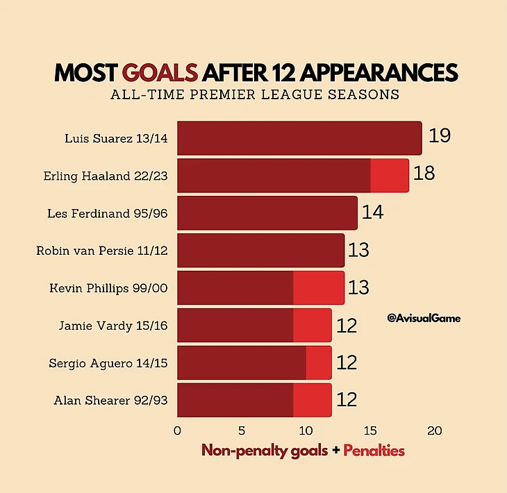 19 голов в 12 матчах! И, кстати, ни одного с пенальти – а у Эрлинга уже три.