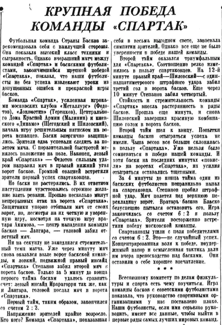 Приезд команды басков в Москву принёс большую пользу лучшим нашим командам. Отсюда напрашивается вывод: надо чаще смотреть футбол европейских футболистов, надо, чаще играть с ними. И в заключение: нельзя ли сыграть с басками еще несколько матчей после их возвращения из Киева и Тбилиси?
