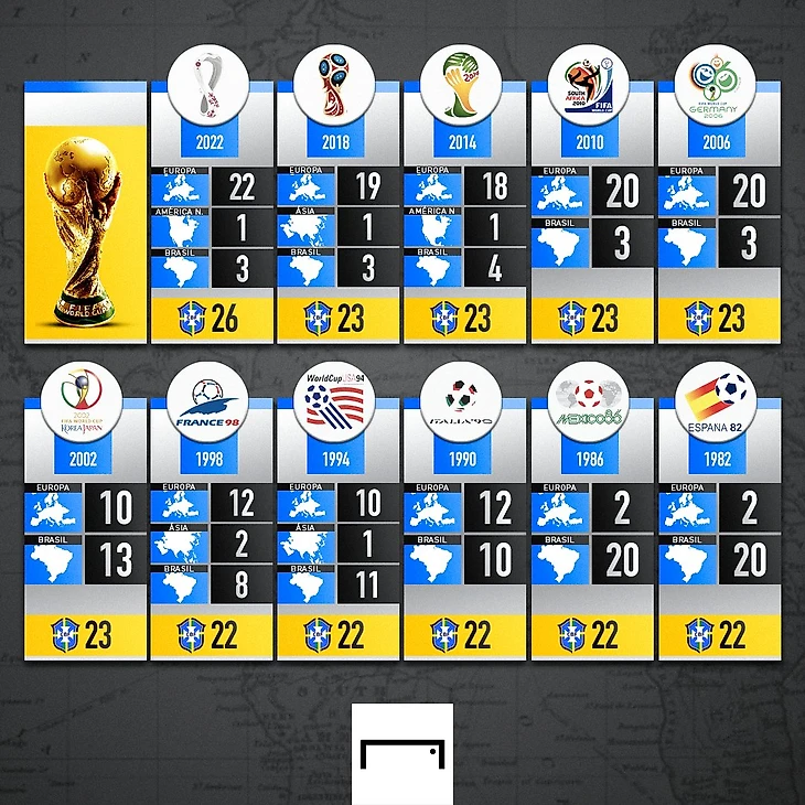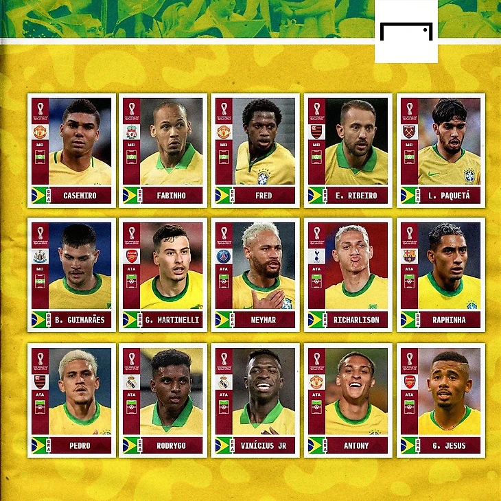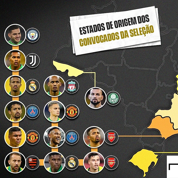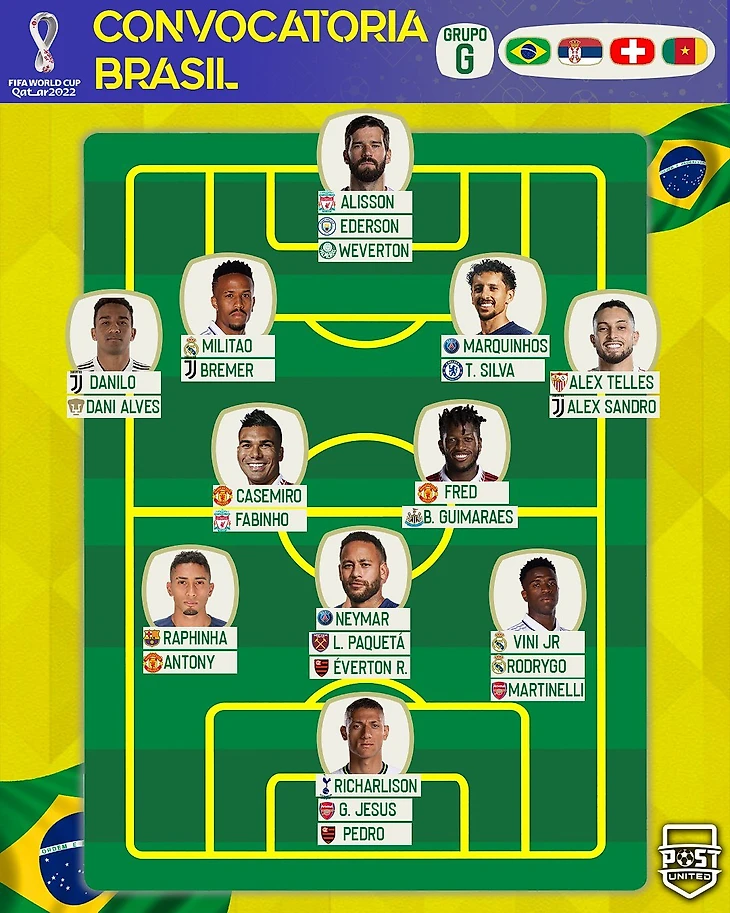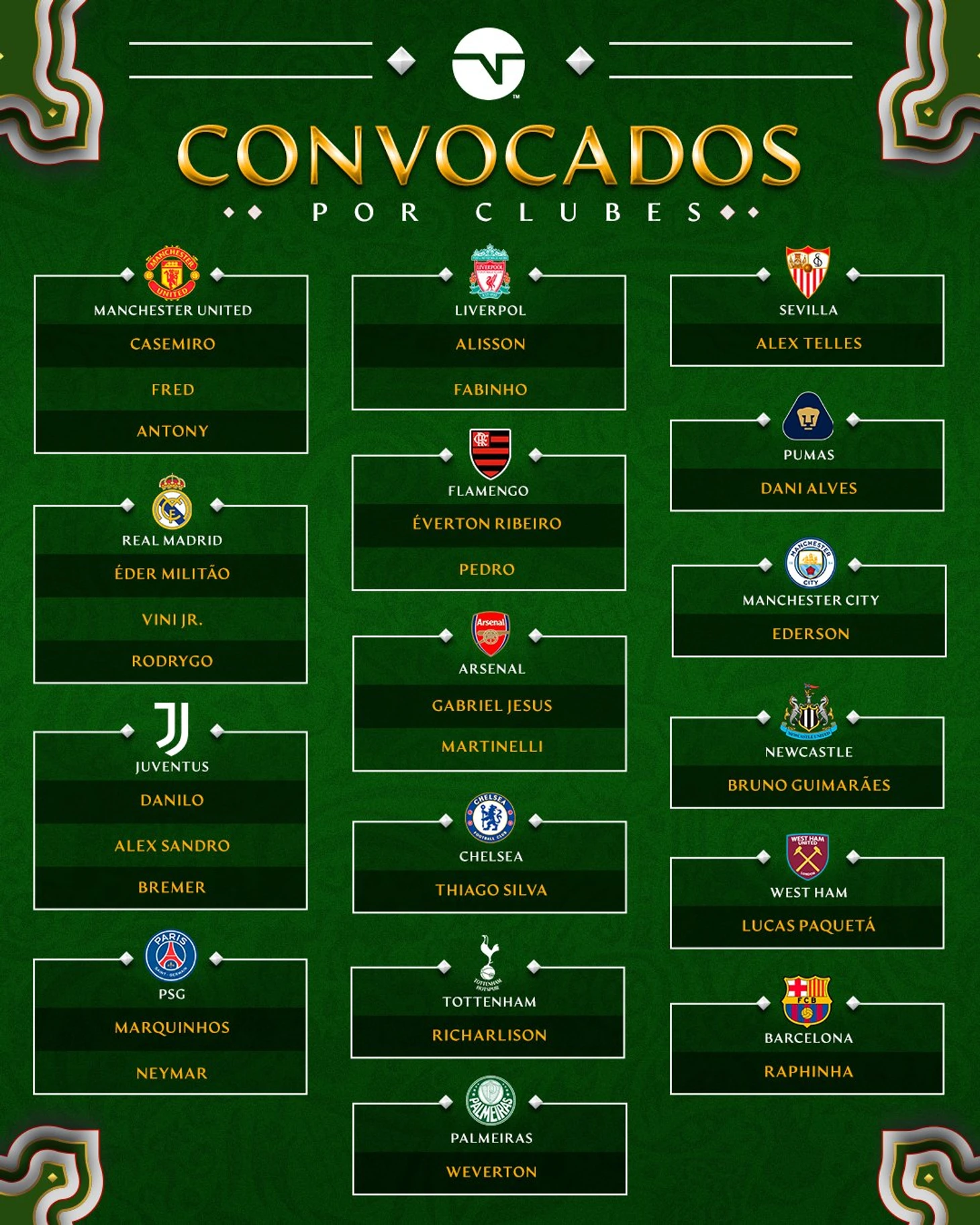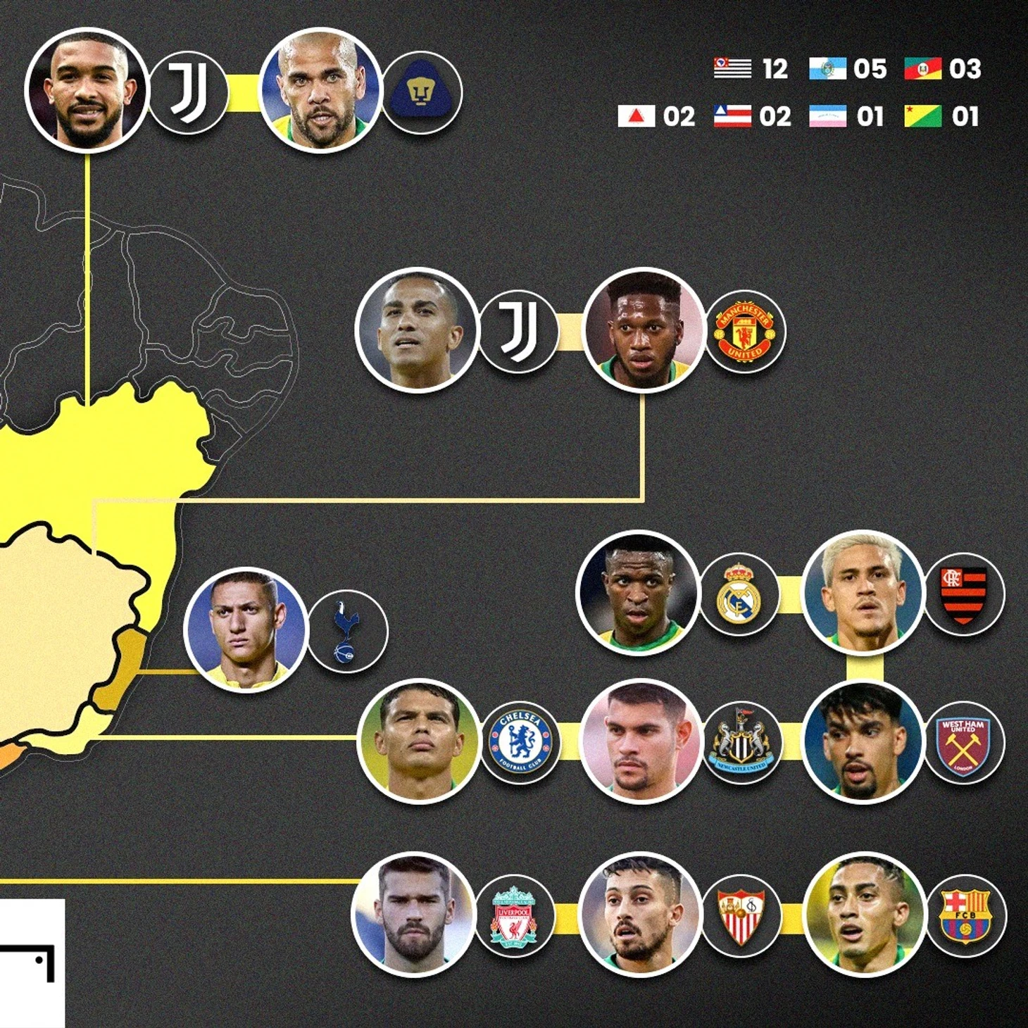 Представительство Селесао-22 по клубам. Больше всех из "Реала", Юнайтед и "Ювентуса".