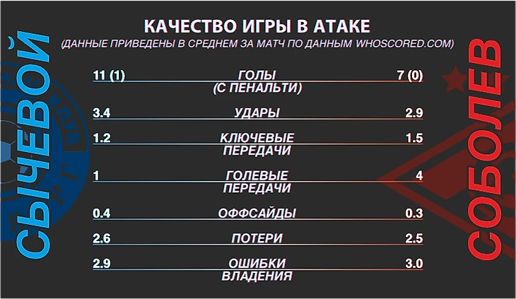 Объясняется эта ситуация, естественно, игровыми задачами и позицией — Сычевой играет на той же позиции, где бегает мертвый Николсон, а мертвый Николсон там бегает из-за отсутствия Мозеса и Бальде (и еще из-за пока необъяснимого недоверия Зиньковскому). К примеру, тот же сайт КтоЗабил.кому (WhoScored.com) утверждает, что Соболев и Сычевой чуть менее, чем полностью идентичны по статистике: один чуть больше бьет, другой чуть больше пасует, одинаково теряют мячи и попадают в оффсайды. Тут снова будет табличка.