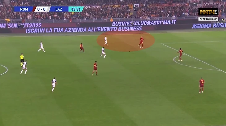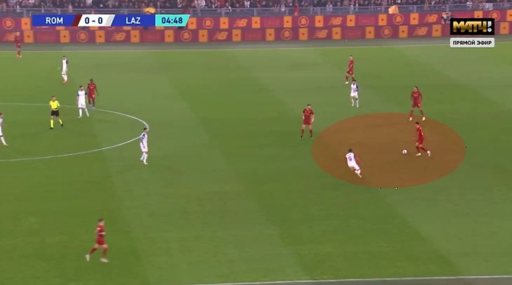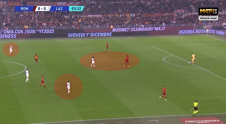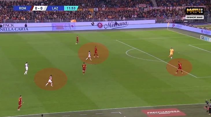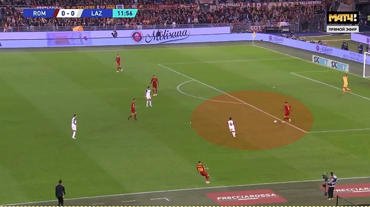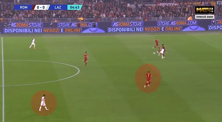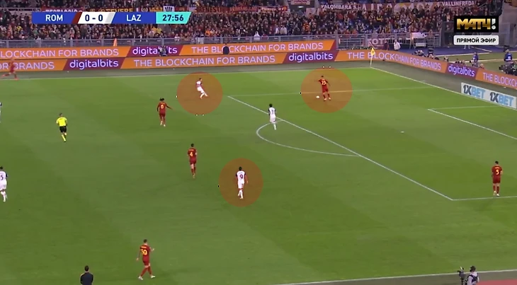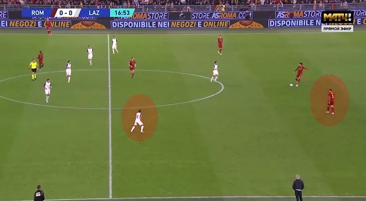 Когда мяч оказывался у Руя Патрисиу, Фелипе Андерсон выдвигался к Крису Смоллингу. Педро и Маттиа Дзакканьи располагаются ниже по своим флангам. Когда мяч отправлялся на правый фланг к Джанлуке Манчини, на него выдвигался Дзакканьи, а, когда на левый – Педро соответственно поднимался к Рожеру Ибанесу.