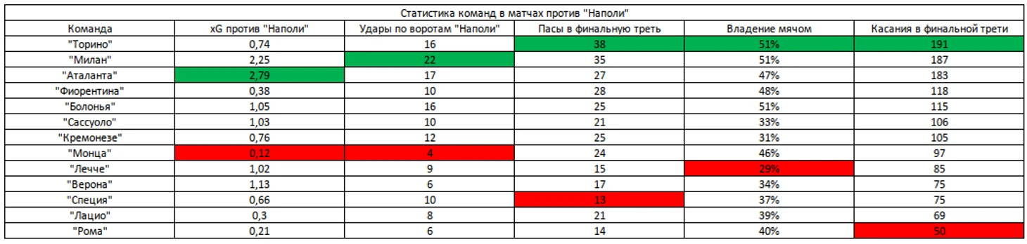 Ниже в таблице приведены показатели команд, которые уже сыграли с «Наполи» в этом сезоне. Так как сортировка от максимального значению к минимальному не стопроцентно совпадает по всем столбцам, поступим чуть проще: самое лучшее значение по отдельному показателю выделено зеленым, а худшее – красным.