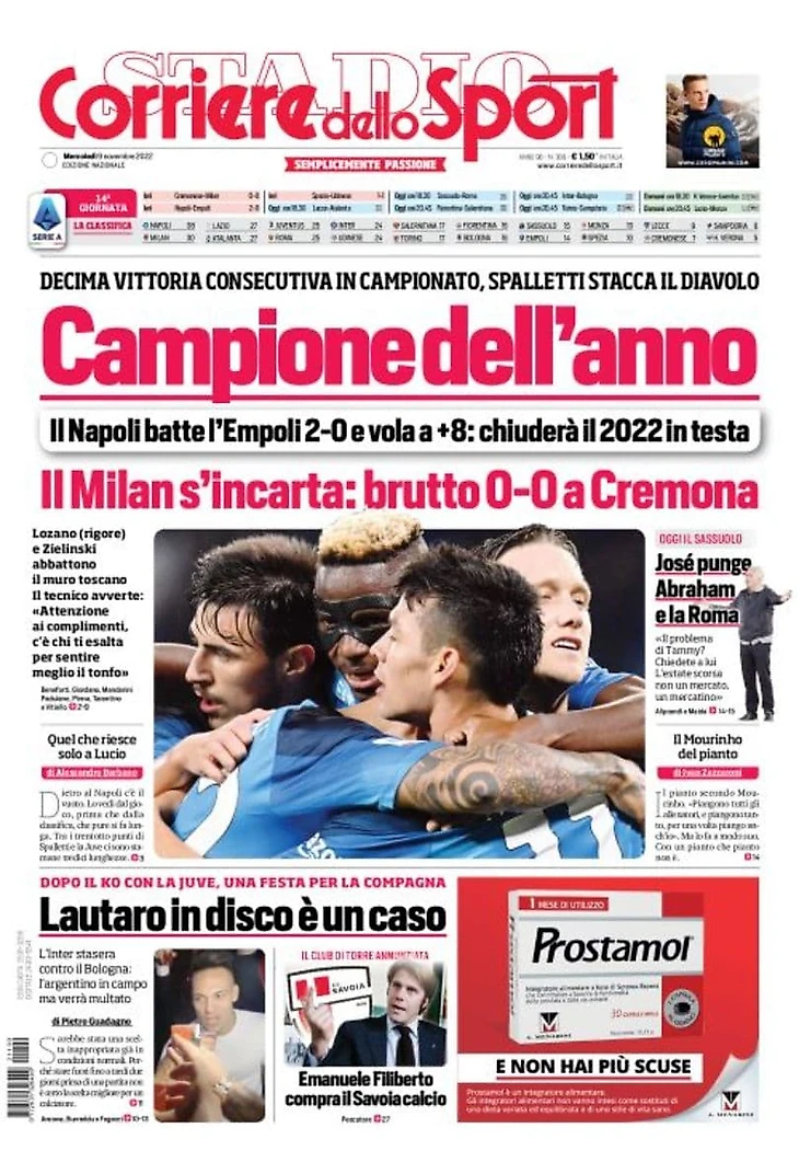 Десятая победа подряд в чемпионате, Спаллетти отрывается от «Дьявола». «Наполи» победил «Эмполи» 2:0 и взлетел на +8: завершает 2022 на вершине. Лосано (пенальти) и Зелиньски пробили тосканскую стену. Тренер предупреждает: «Внимание к комплиментам, есть те, кто хвалят тебя, чтобы лучше услышать провал».