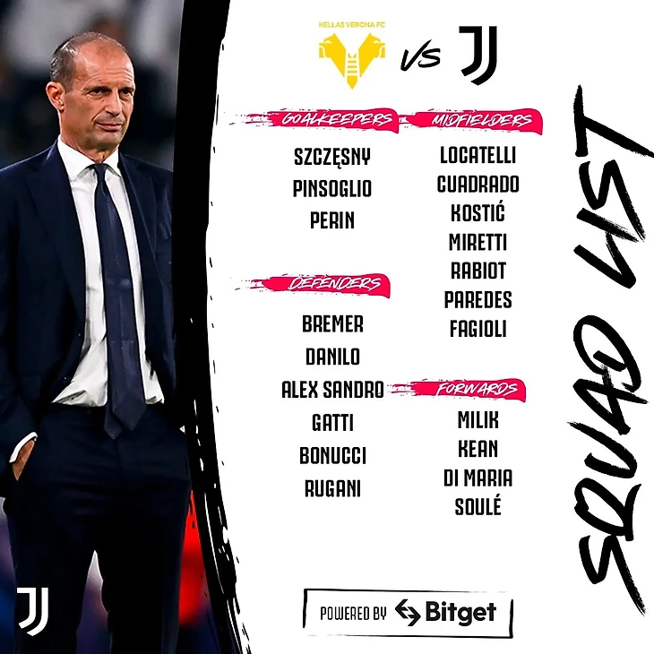 «Ювентус» обнародовал заявку на сегодняшний матч с «Вероной». Помимо Влаховича, об отсутствии которого стало известно заранее, на поле не будет и Федерико Кьезы, который сыграл против «ПСЖ» и «Интера» после 8 месяцев вынужденного отсутствия.
