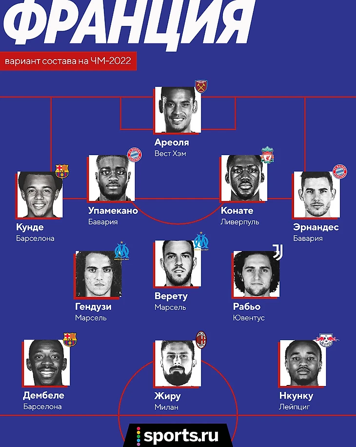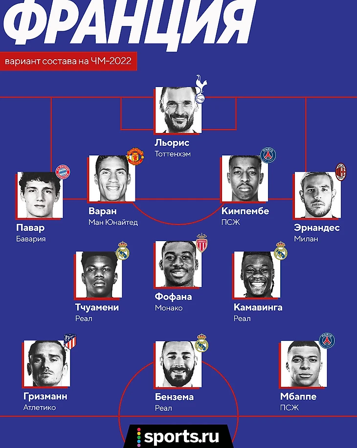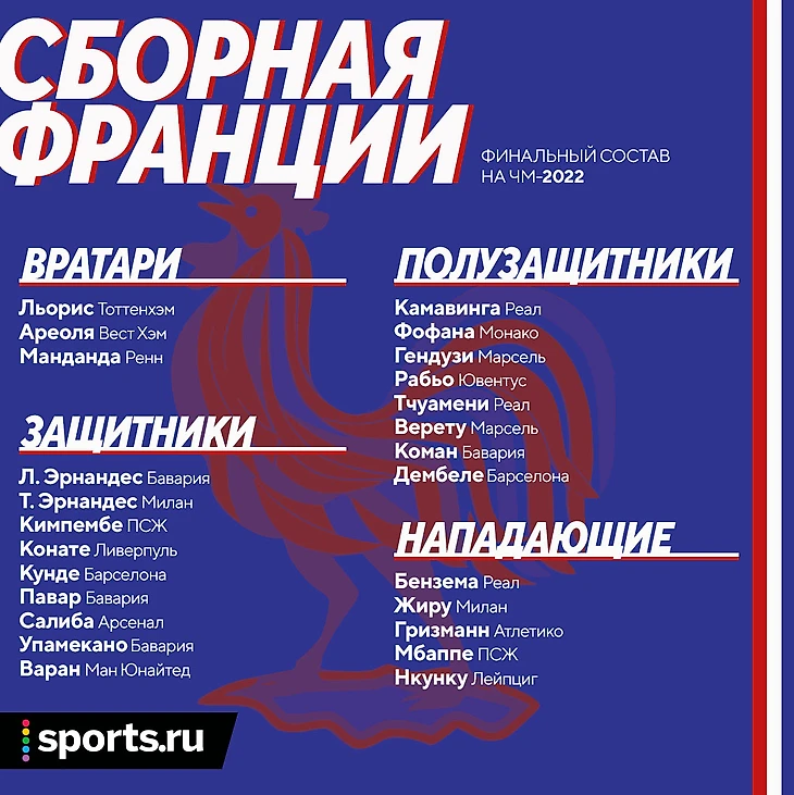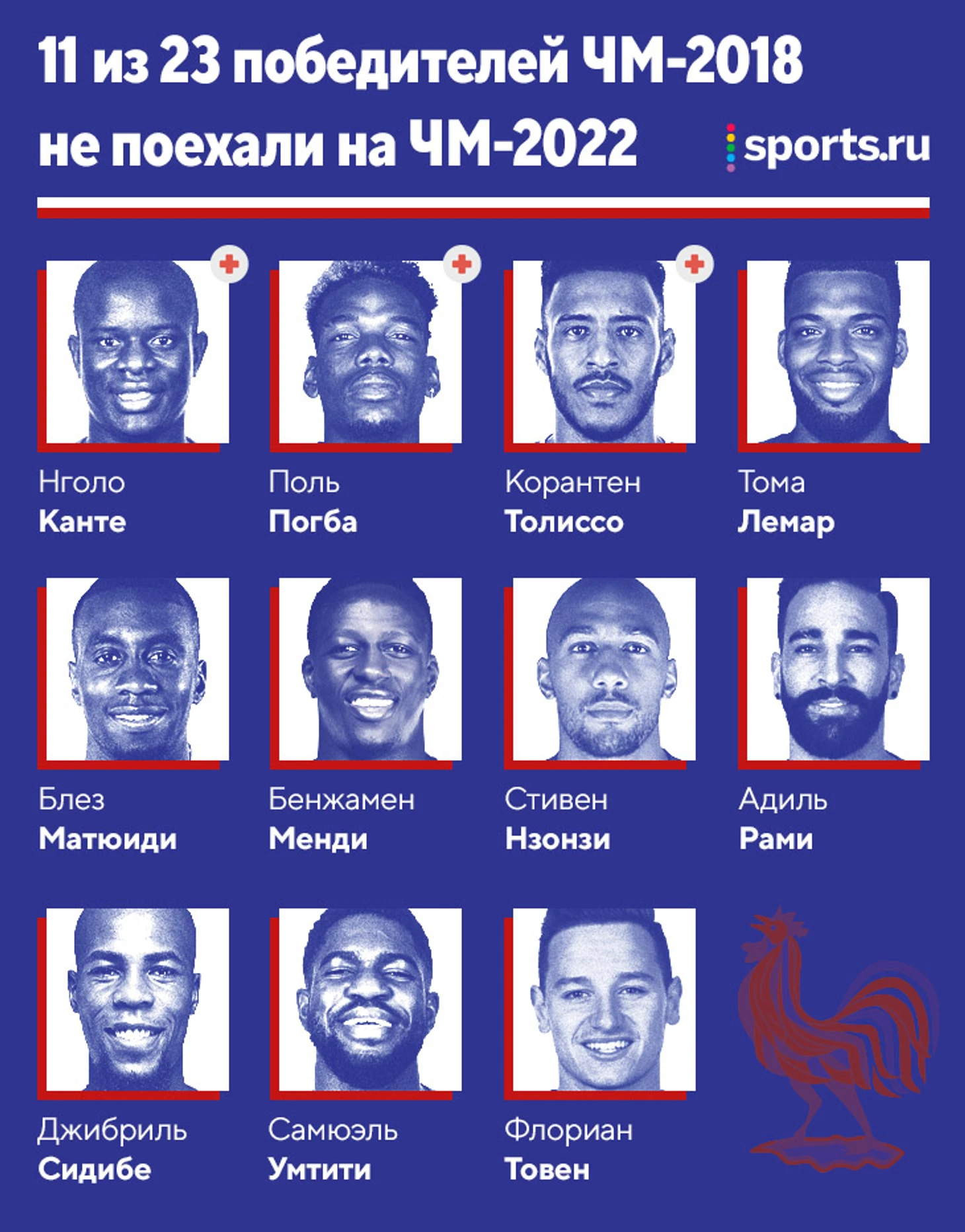 От чемпионской команды 2018-го в сборной остались далеко не все. В Катар не едут сразу 11 игроков из состава, которым Дешам играл в России. Кто-то вылетел с травмами, кто-то проводит время в суде, а кто-то уже просто не тянет уровень сборной.