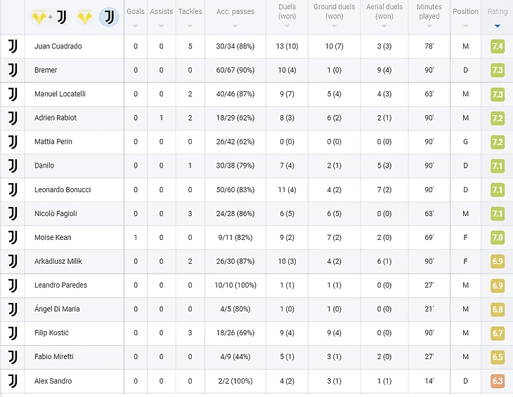 Лучшим игроком матча можно назвать Хуана Куадрадо. Несмотря на то, что гол организовали другие, колумбиец был очень активен на фланге, причем выполнял работу не только в атаке, но и в защите: в его активе 3 выноса, 2 перехвата и целых 5 отборов. Также он был успешен как в наземных дуэлях (7/10), так и в воздушных (3/3).
