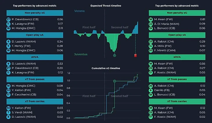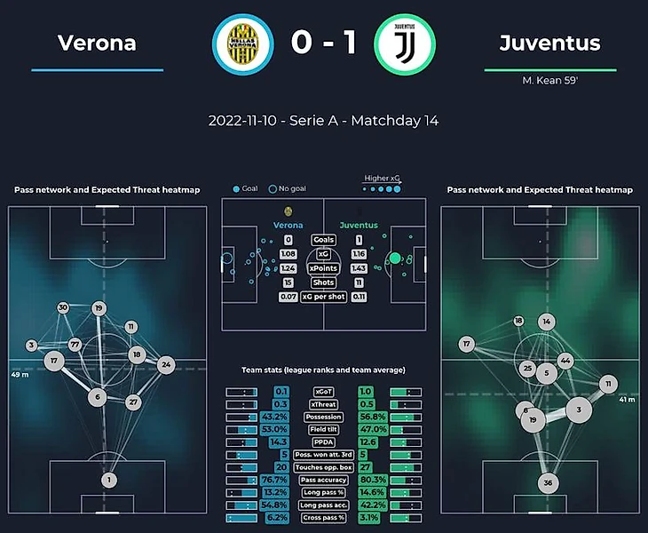 Верона больше и опаснее била по воротам, но в действительно голевых эпизодах обе команды равны - всего по одному удару. Разница лишь в реализации: Кину создали более комфортные условия, и даже здесь он пробил довольно криво и с рикошетом. Не впечатляющая атакующая игра от Аллегри с равным xG с самой худшей командой Италии.
