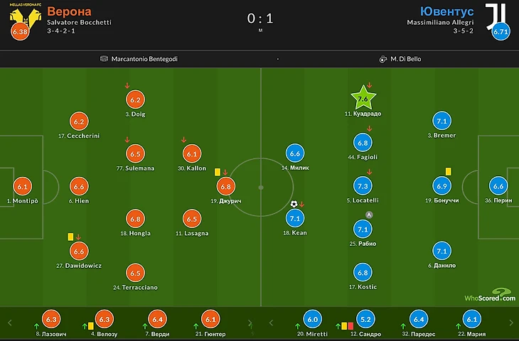 Матч запомнился феерией из неточных передач от обеих команд. 80,3% точности Ювентуса на 76,7% точности у Вероны. Аллегри сделал ставку на длинные передачи, составившие почти половину от общего числа, и большинство из них шли в никуда.