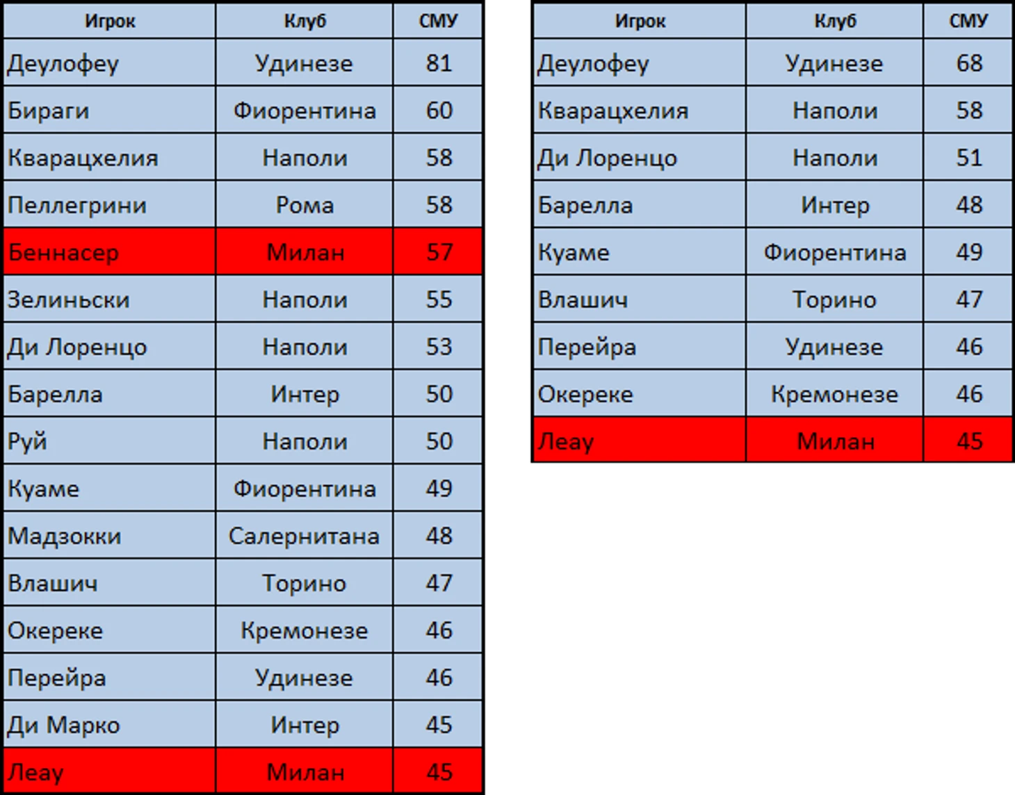 Если брать в расчет ожидаемые ассисты Леау прямо на границе топ-20 всего с 2,4 xA – выше его, к примеру, такие игроки, как Филип Костич из «Юве» (3,6 xA), Дензел Дюмфрис из «Интера» (3,2 xA), Маттео Политано и Мариу Руй из «Наполи» (оба – по 2,7 xA). В пересчете на 90 минут, кстати, Леау по этому показателю и вовсе на одну строчку ниже топ-20.