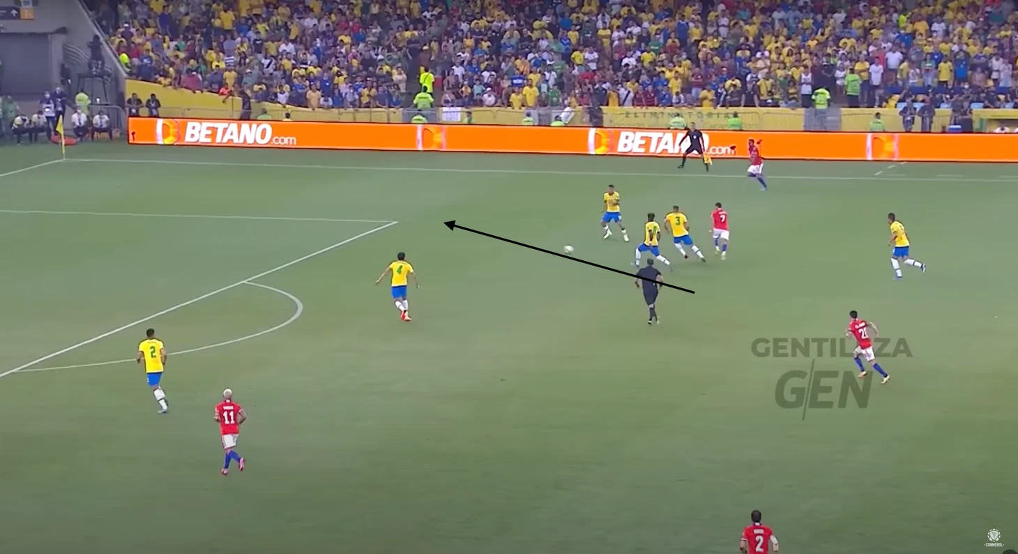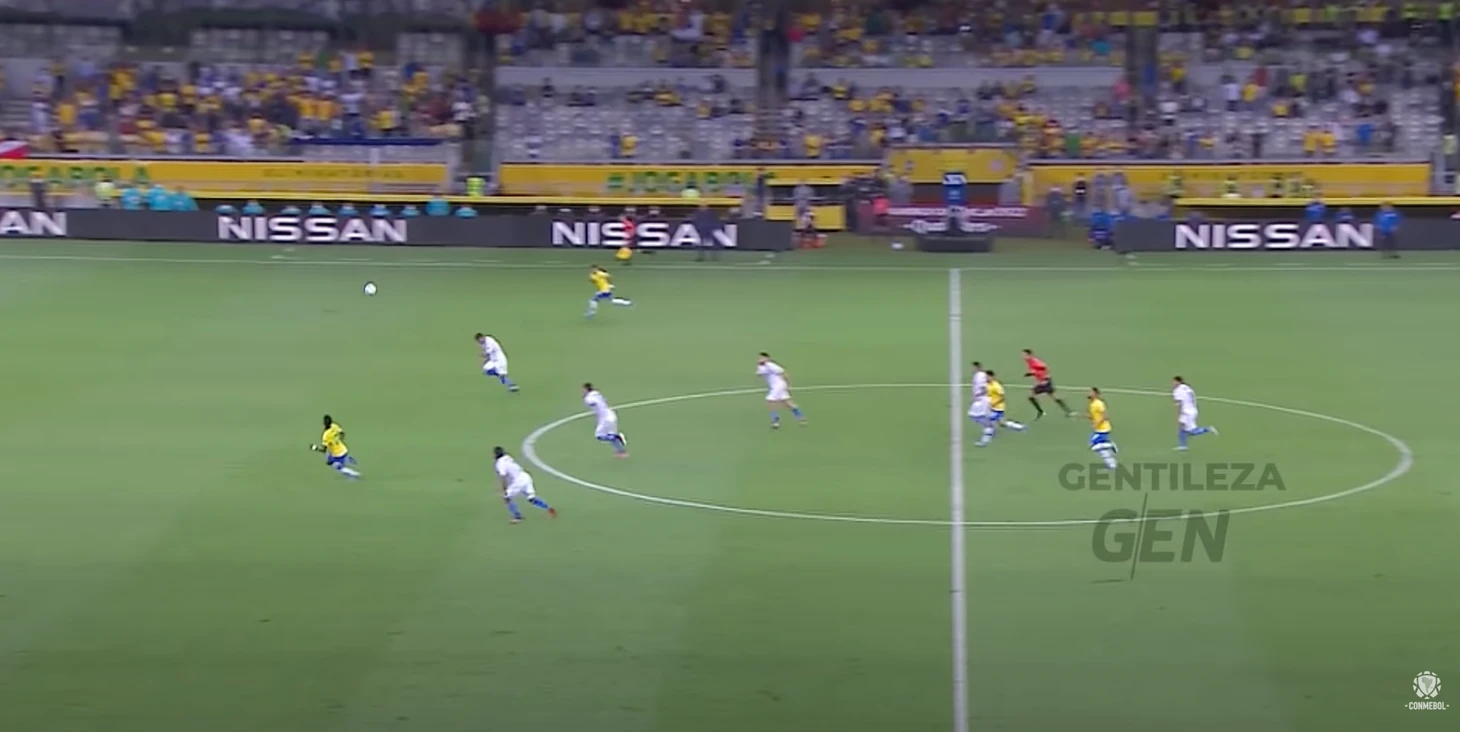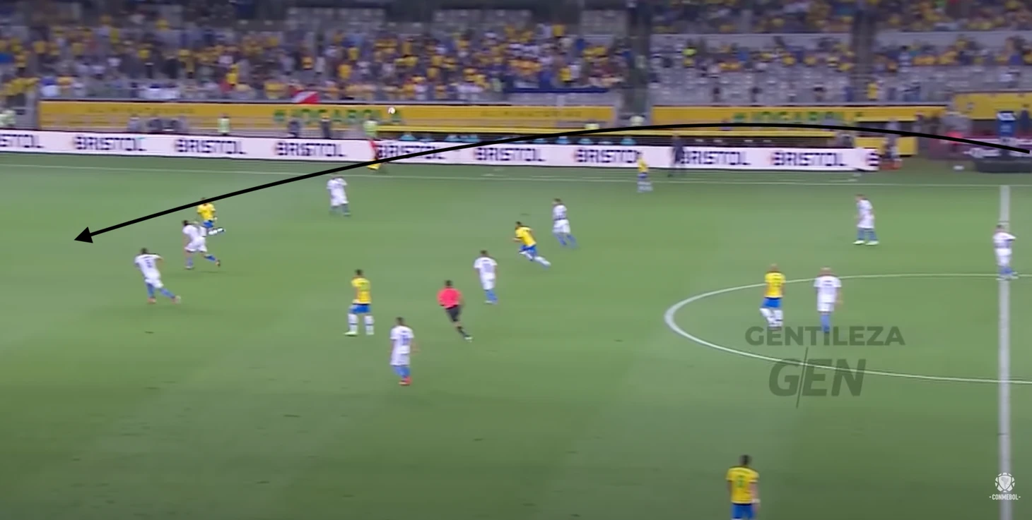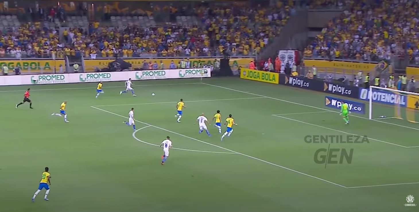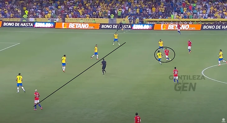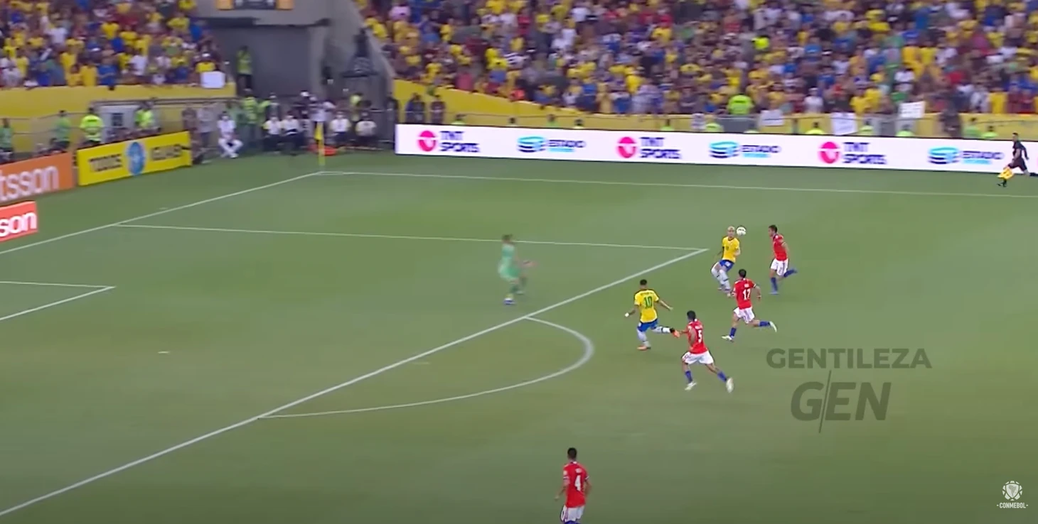 Снова передача Маркиньоса, но уже в матче с Парагваем. А знаете, что в них самое главное? Правильно – им нельзя противостоять, можно только опередить забегающего игрока.