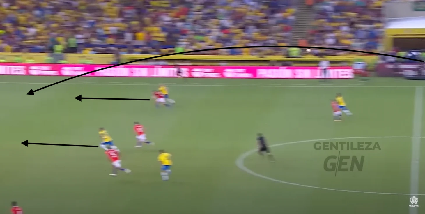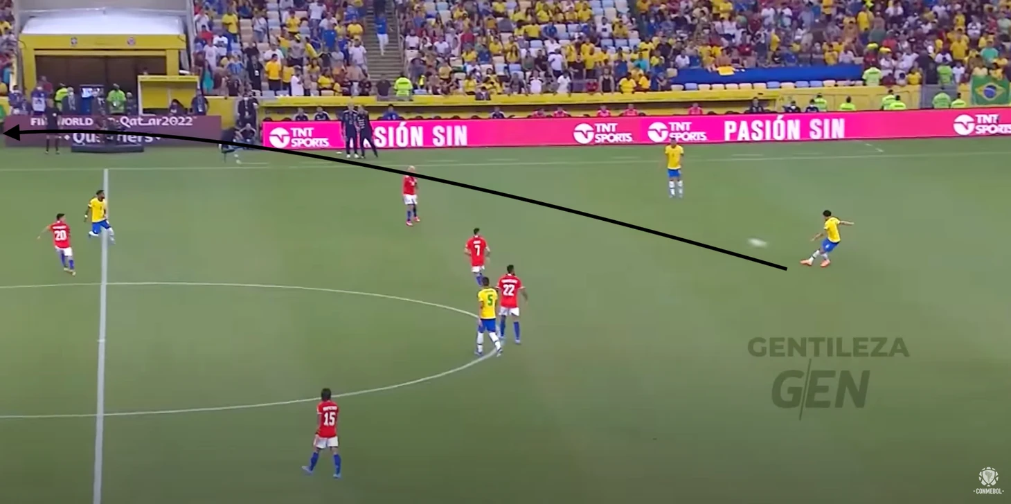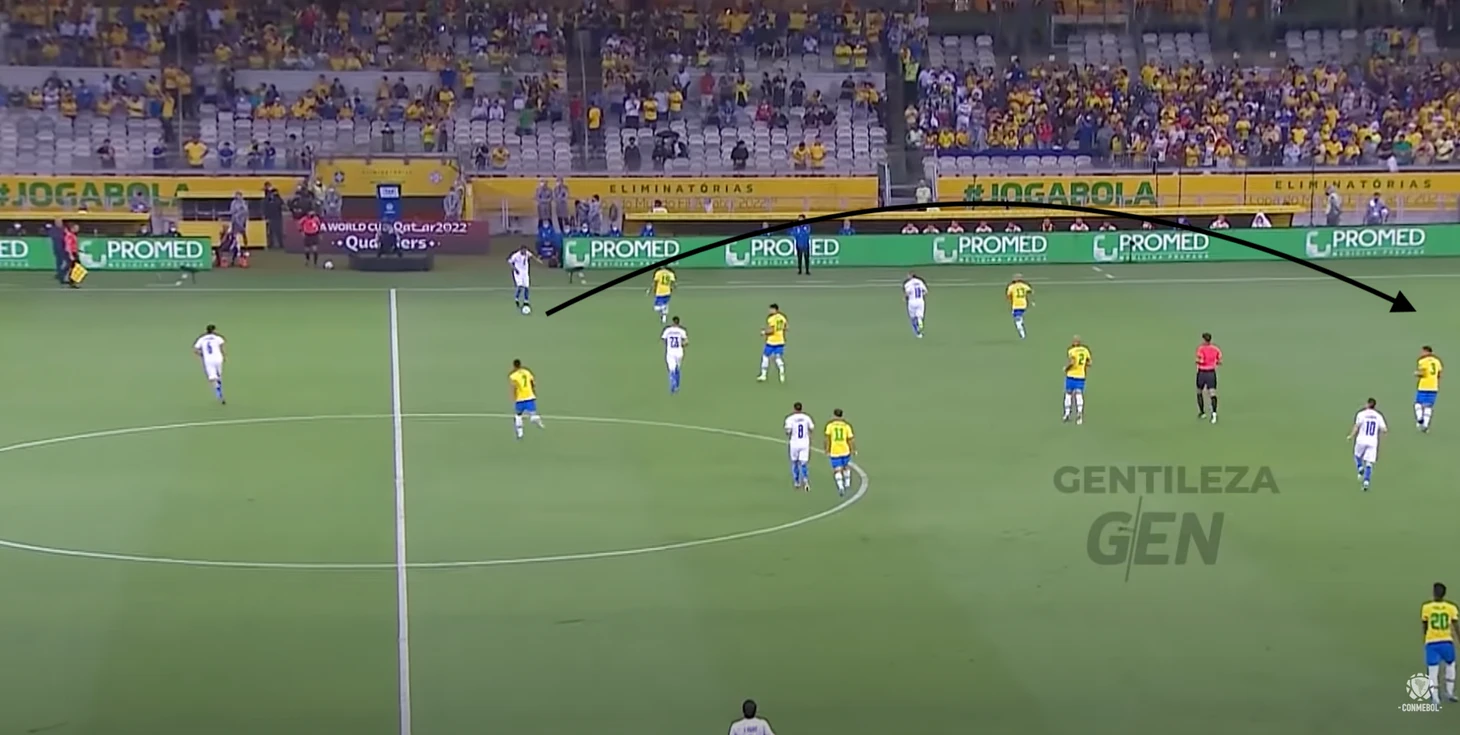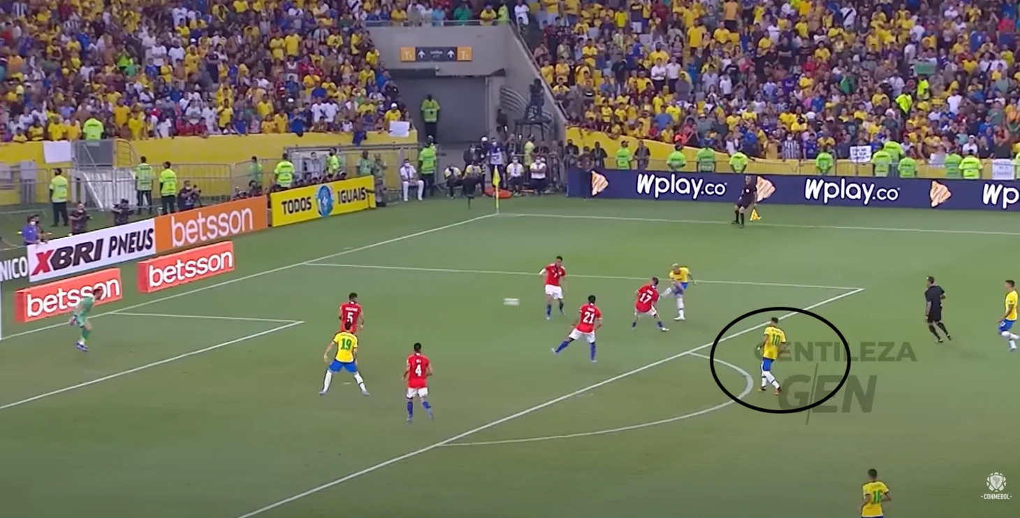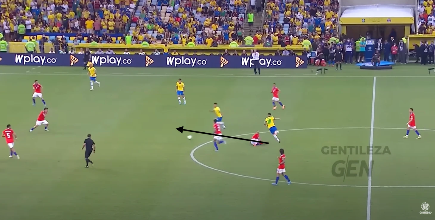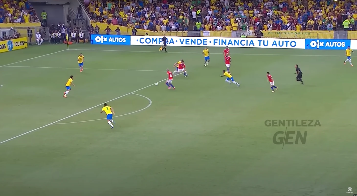 Снова передача Маркиньоса, но уже в матче с Парагваем. А знаете, что в них самое главное? Правильно – им нельзя противостоять, можно только опередить забегающего игрока.