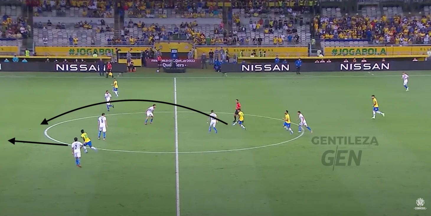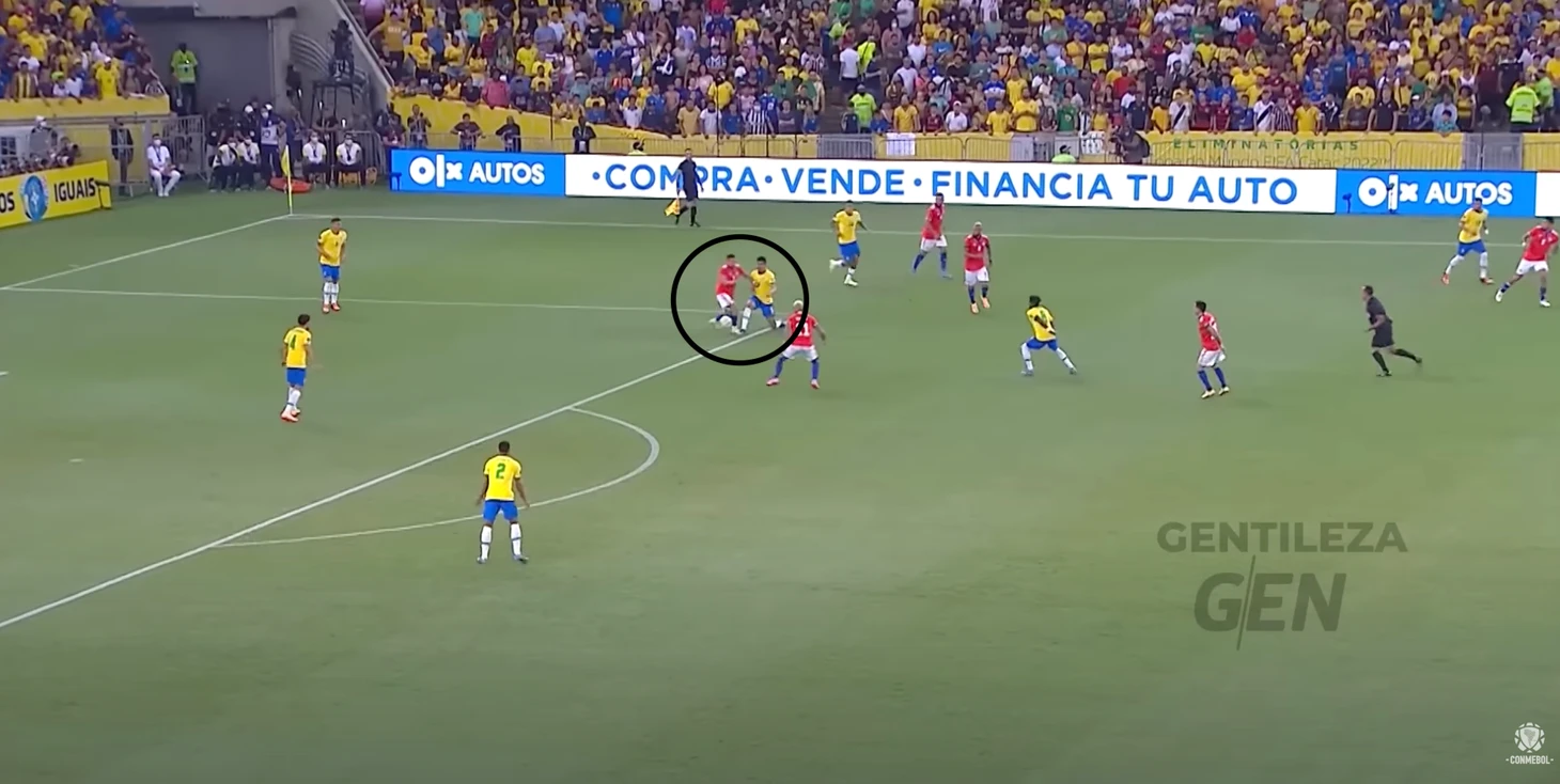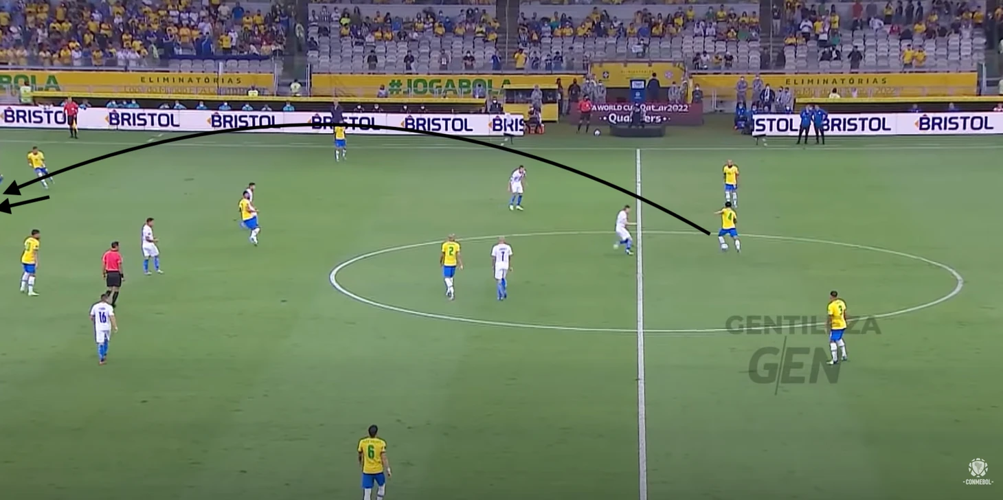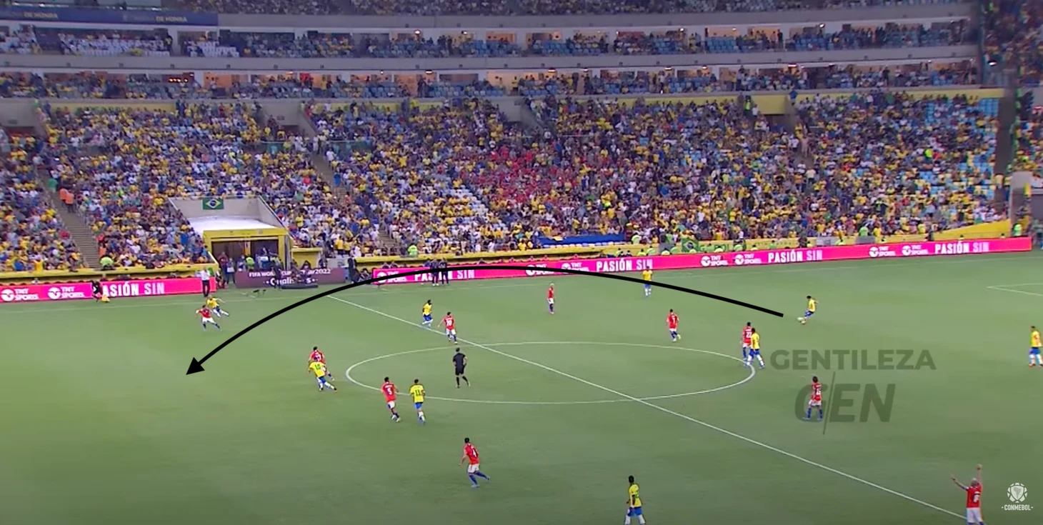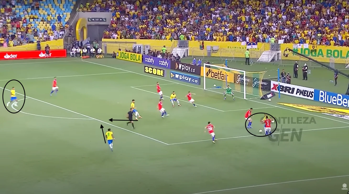 Снова передача Маркиньоса, но уже в матче с Парагваем. А знаете, что в них самое главное? Правильно – им нельзя противостоять, можно только опередить забегающего игрока.