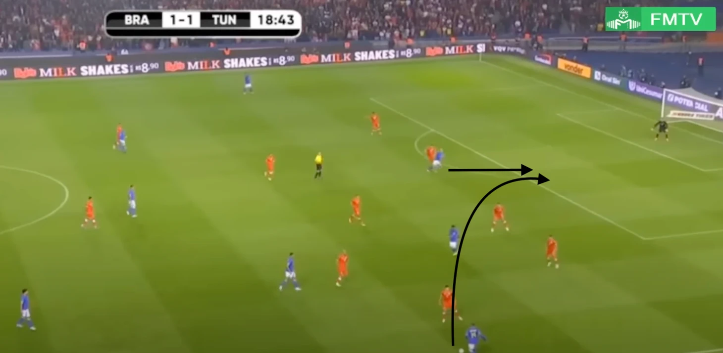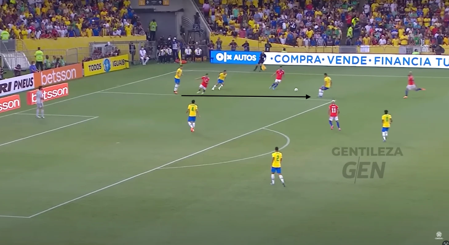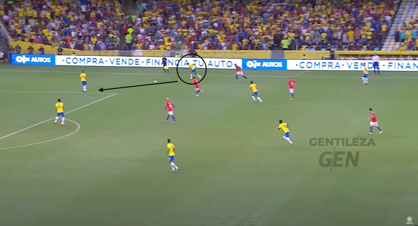Такие привычные современному футболу забегания и забросы имеют место и в сборной Бразилии. Это не самая тактически сложная фишка, но определенный уровень мастерства и взаимопонимания здесь необходим.