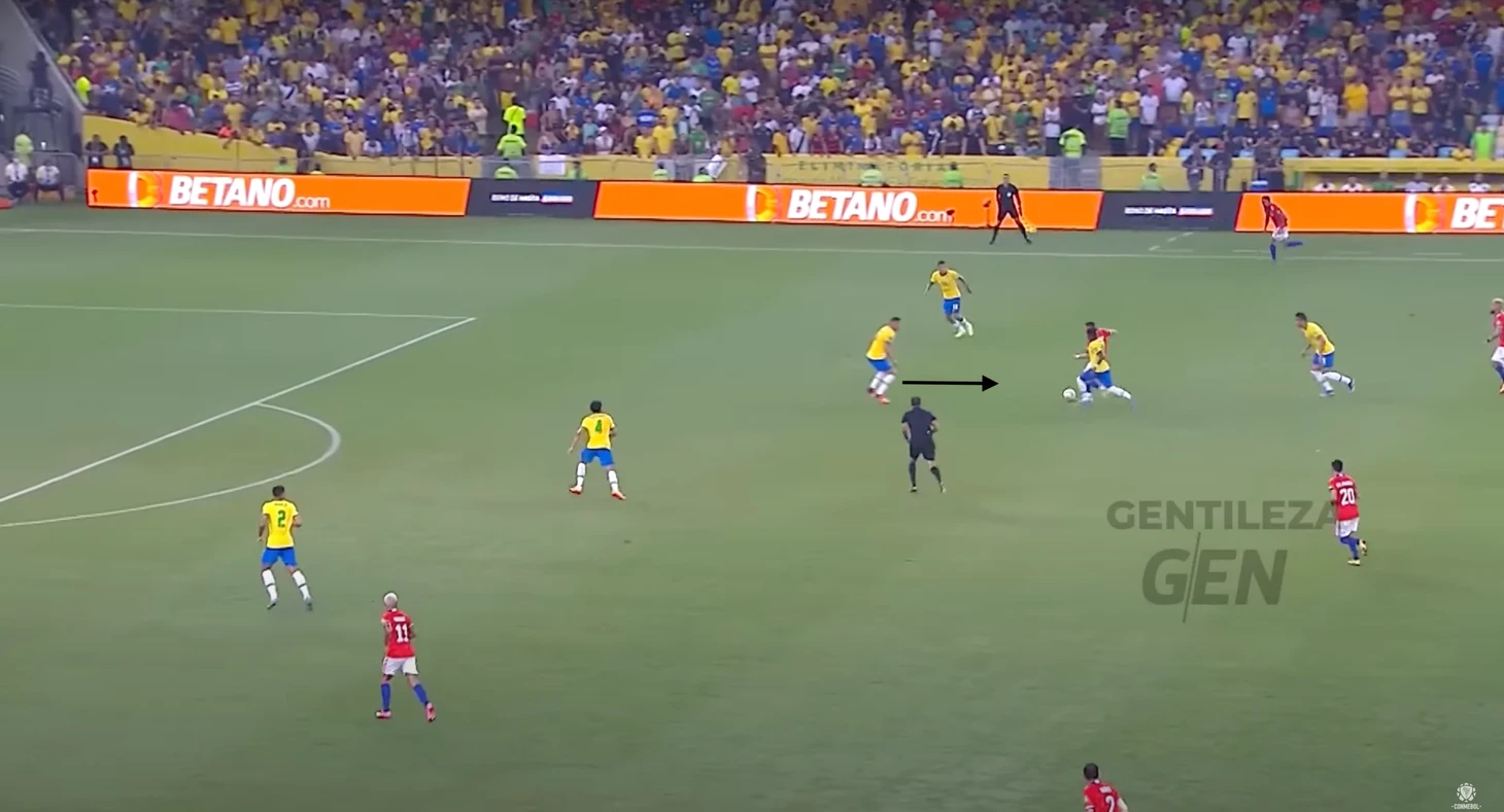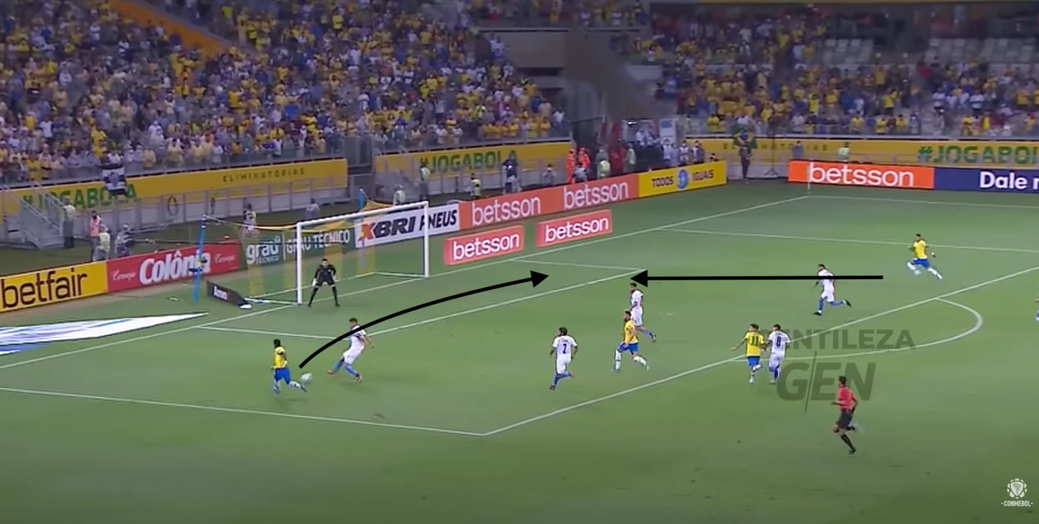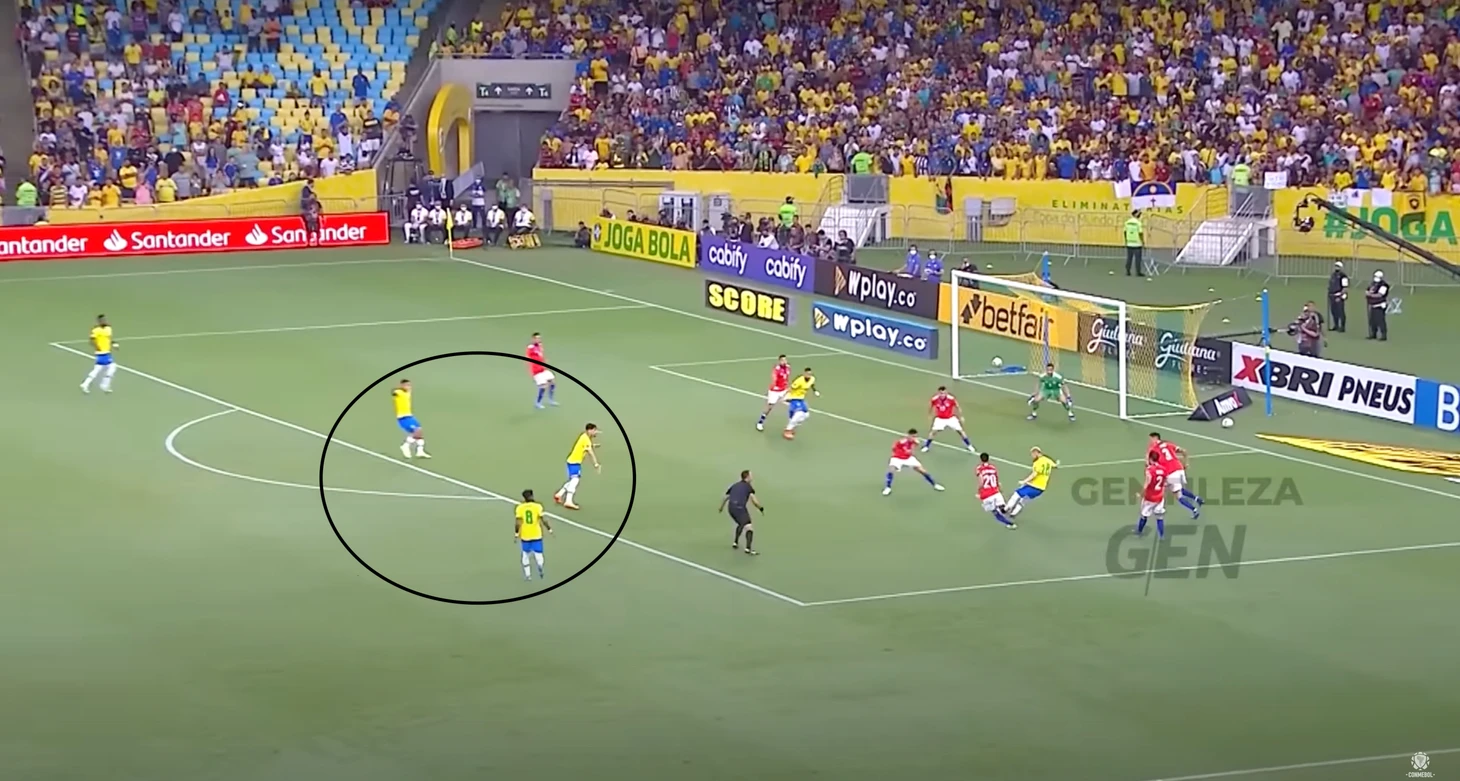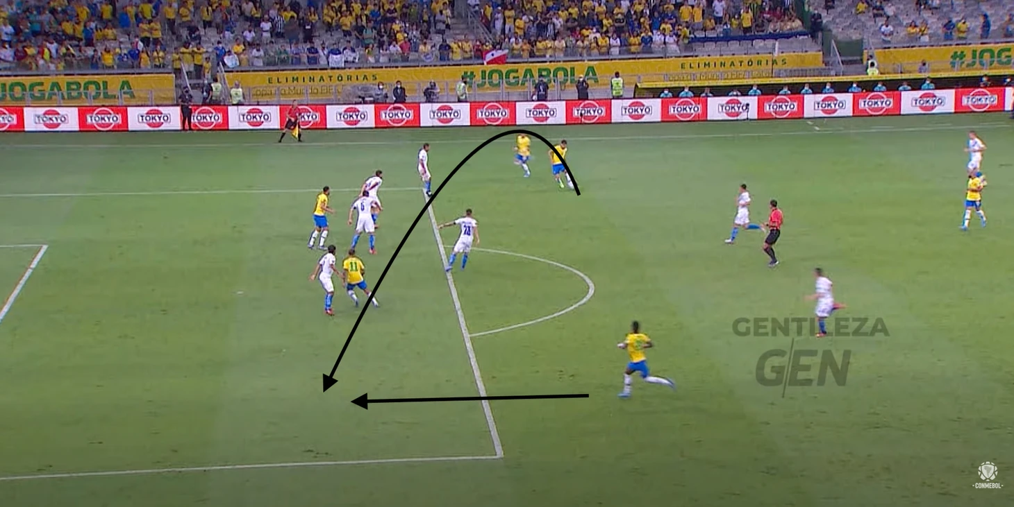 Такие привычные современному футболу забегания и забросы имеют место и в сборной Бразилии. Это не самая тактически сложная фишка, но определенный уровень мастерства и взаимопонимания здесь необходим.