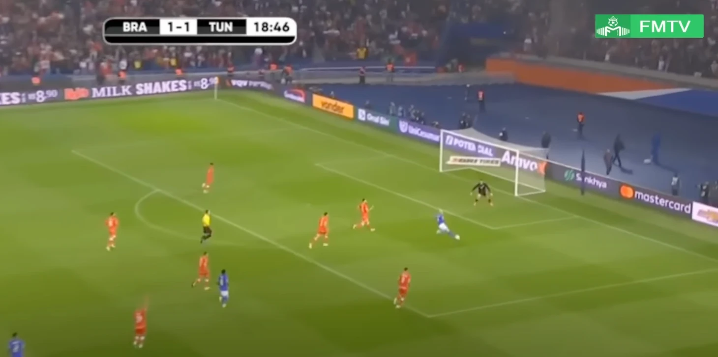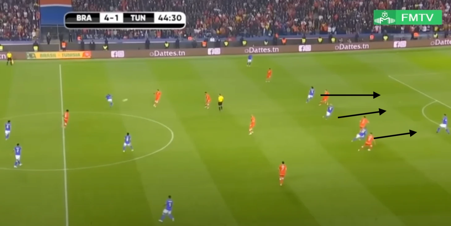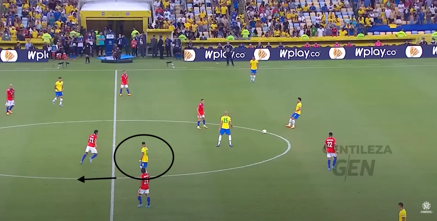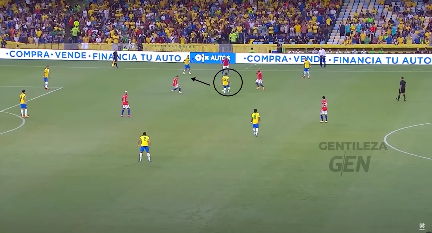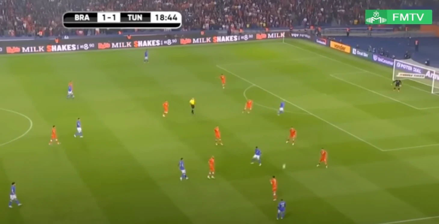 Обратите внимание, как низко располагается Неймар, учитывая то, что Бразилия находится в позиционной атаке.