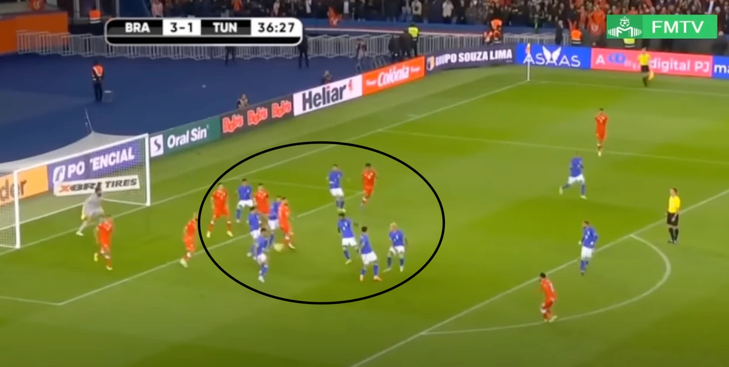 Когда ситуация не позволяет выкатить мяч на ворота, то внимание уделяется границе штрафной площади, где бразильские футболисты уже готовы принять мяч.