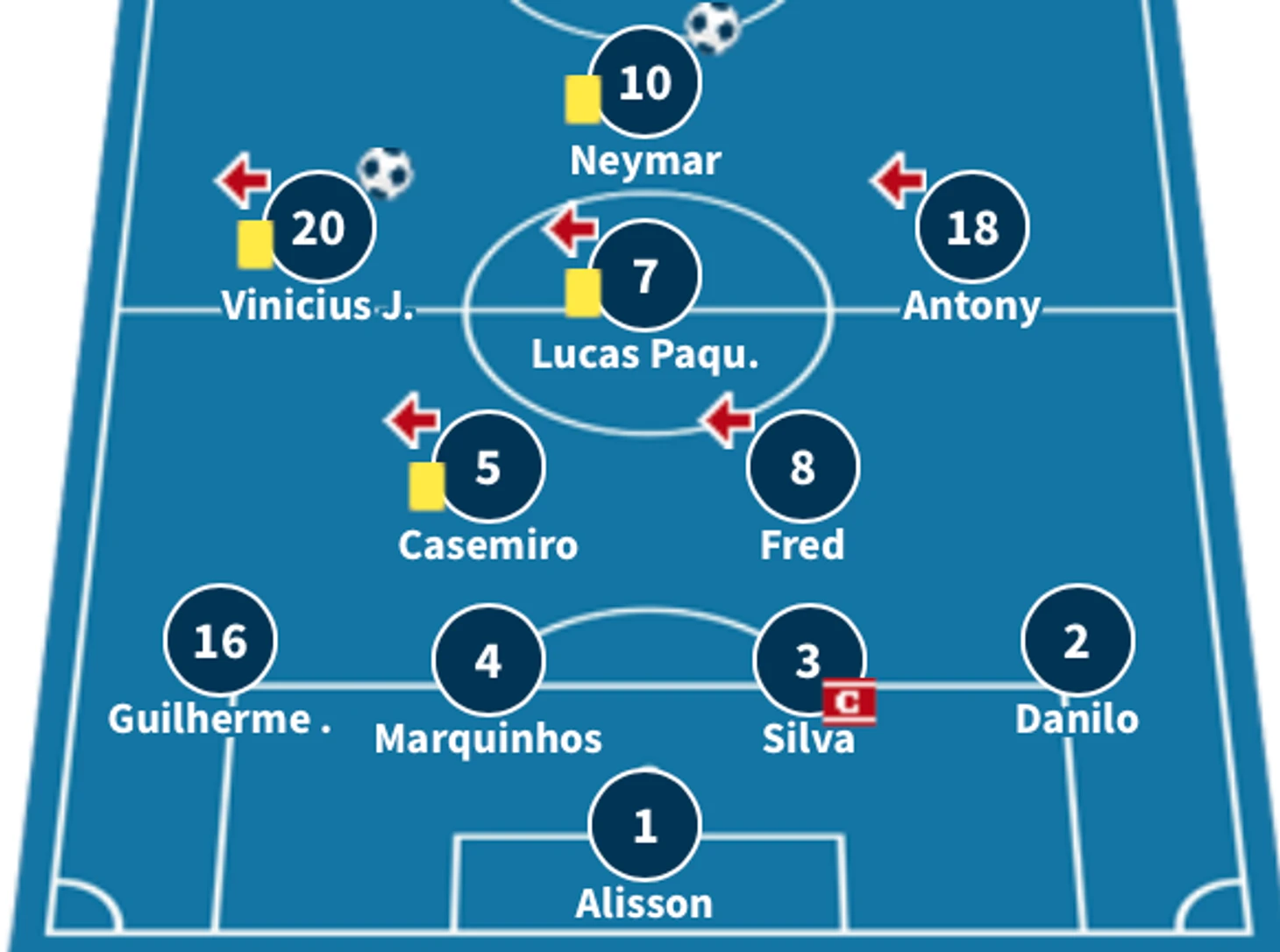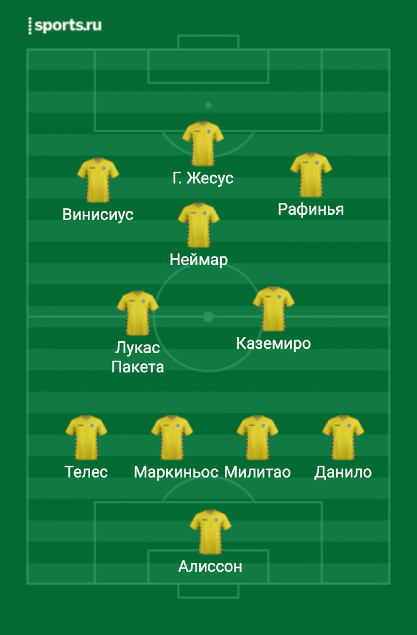 Полузащита: Пакета – Каземиро в опорной зоне, Винисиус – Неймар – Рафинья в атакующей.