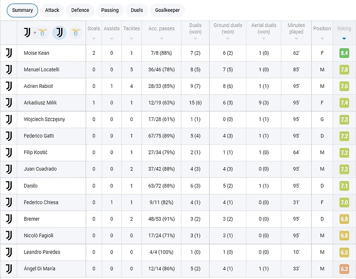Лучшим игроком матча стал Мойзе Кин. Он сделал дубль, который принес команде победу над серьезным соперником. При этом итальянец всего пять раз потерял мяч, нанес три удара. В одном из моментов пожадничал, но в общем и целом − крепкий матч. Кин не делал дубль с сезона-2018/2019 − тогда пострадал «Удинезе» (4:1).