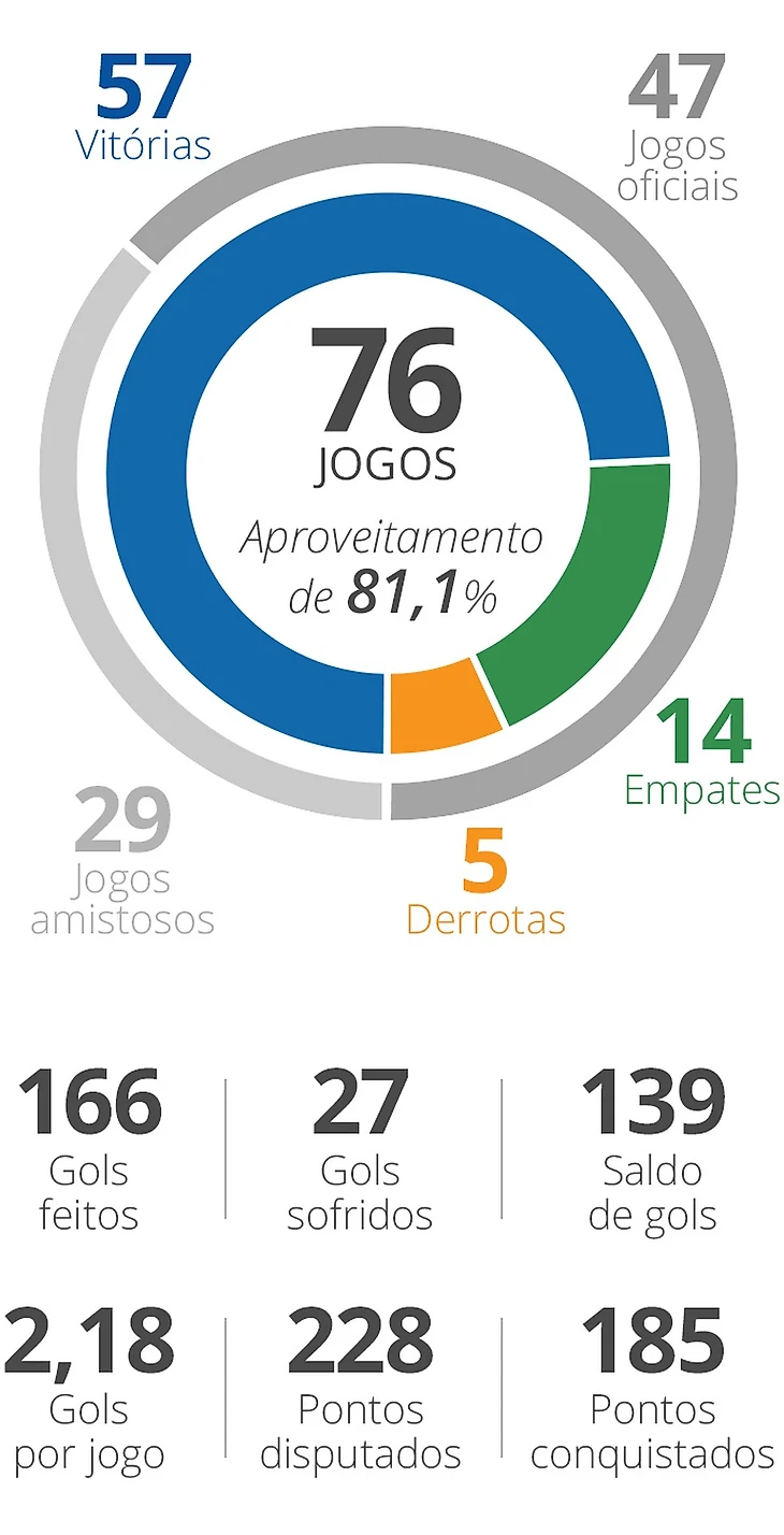 Бегло оглянемся на 6 лет правления Аденора Бакши во главе сборной Бразилии. За 2275 дней сыграно 76 матчей. Забито 166 и пропущено 27 голов.