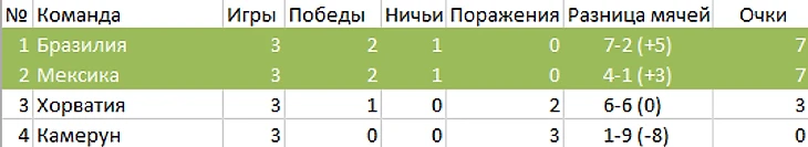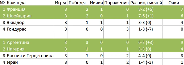 Из группы E без особых проблем выйдут в плей-офф французы и швейцарцы, тоже самое можно сказать и про сборную Аргентины в группе F. Представители «альбиселесте» будут так хороши на групповой стадии, что заставят бедного боснийца Сеада Колашинаца забить самый быстрый автогол в истории Чемпионатов Мира.