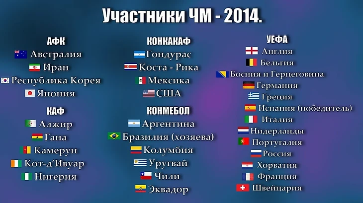 Смотря на список участников Чемпионата Мира в Бразилии радует присутствие сборной России. Подопечные Фабио Капелло лихо преодолели отборочный этап (досталось даже португальцам) и спустя 12 лет вернулись бороться за титул. Среди дебютантов выделялась лишь Босния и Герцеговина.