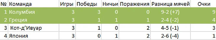 Группа C запомнится прежде всего ярким выступлением сборной Колумбии, в которой зарождалась новая мировая звезда Хамес Родригес, а также бойцовским характером греков. Эллины вырвут счастливую путёвку в плей-офф в компенсированное время игры с Кот-д’Ивуаром.