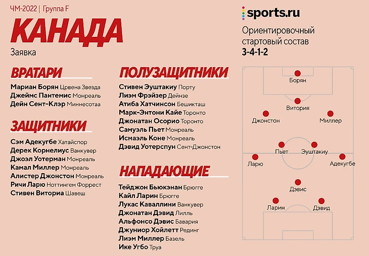 Как играют. Эта сборная очень вариативна, канадцы меняют схемы в зависимости от соперника. В последних товарняках Хердман наигрывал 3-4-2-1 – при этом на краю полузащиты часто играли фактически защитники, так что при необходимости канадцы могут обороняться большими силами. С Бельгией и Хорватией можно ожидать 5 игроков в защиту уже со старта.