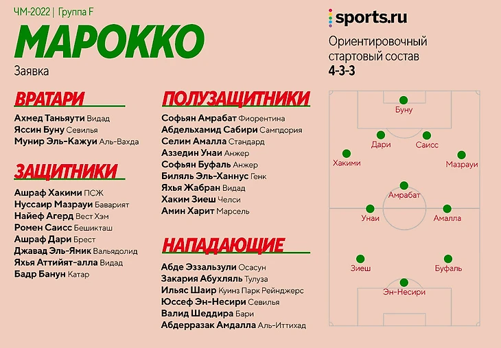 Как играют. В сентябрьских товарищеских матчах сборная начинала со схемой 4-3-3, которые затем трансформировались в более оборонительные 4-1-4-1. У марокканцев одна из сильнейших пар крайних защитников на турнире – Хакими и Мазрауи, которые точно будут бегать вперед и поддерживать атаку. Но кому-то из них придется уйти на менее знакомый левый фланг.
