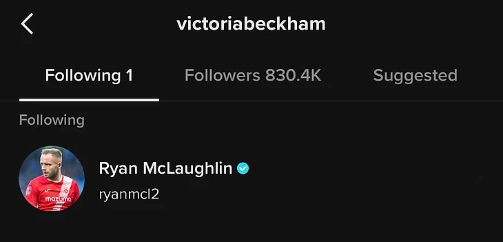 При этом Виктория не подписана на Дэвида, зато ее аккаунт на какое-то время подписался на защитника клуба «Моркэм» Райана Маклафлина. Стоп, чего-чего?