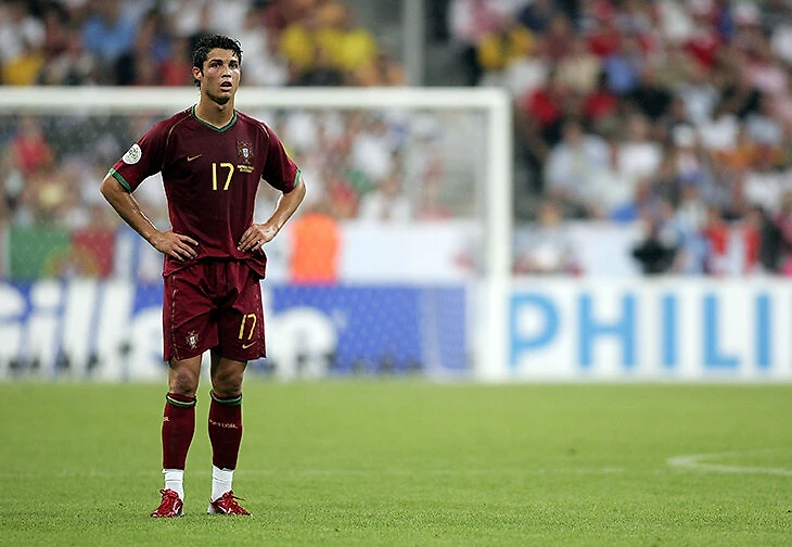 • ЧМ-2006. В Германию 21-летний Криштиану ехал уже звездой, поэтому провел на турнире все матчи, кроме третьего в группе – игра с Мексикой для Португалии уже ничего не значила. Первый гол на ЧМ Роналду забил Ирану с пенальти – ровно через день после мяча Месси Сербии и Черногории!
