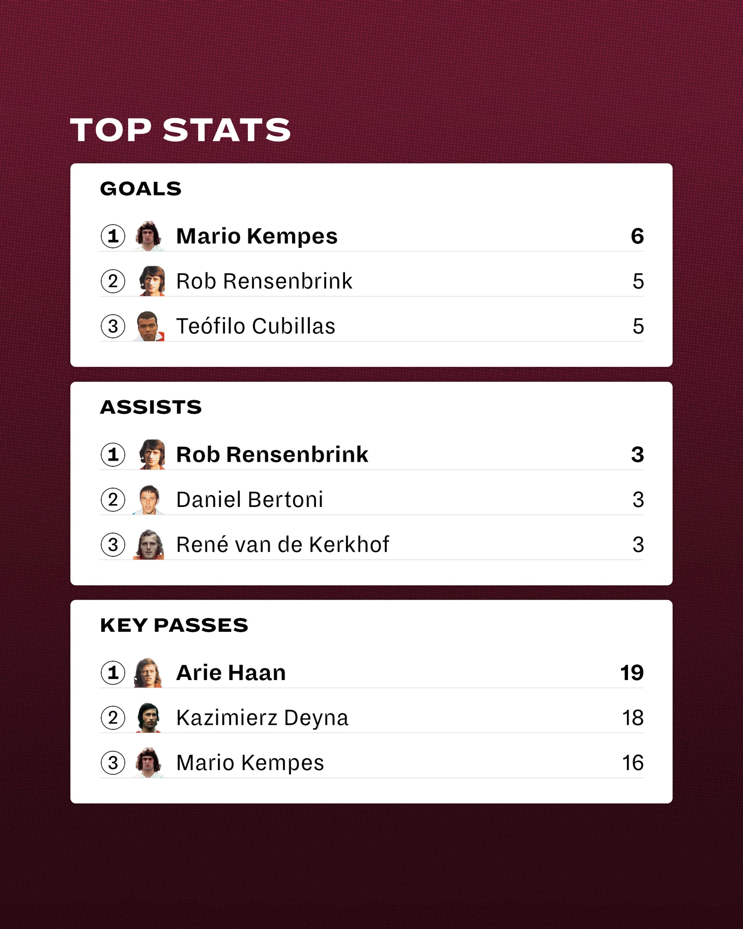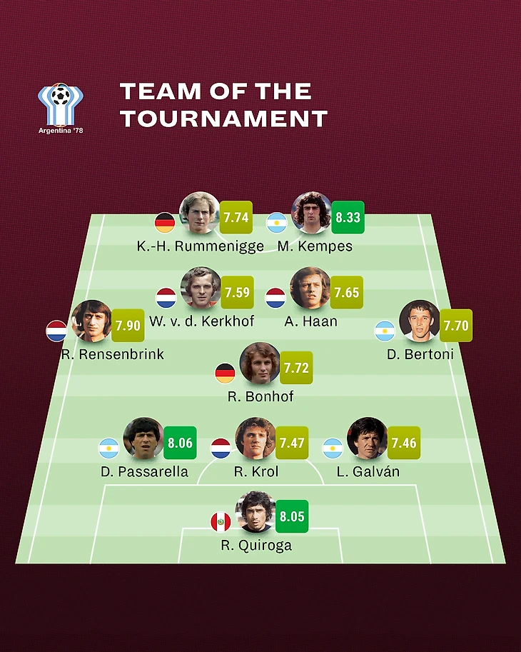 В следующий раунд хозяева вышли со второго места и там дела пошли вверх – Марио поиздевался над поляками, оформив дубль, еще дубль перуанцам – и – вуаля! – Альбиселесте в финале принимали Нидерланды. Там – тоже дубль, причем второй мяч Кемпес забил в дополнительное время. Соперник мог похоронить надежды Менотти на успех: за несколько минут до завершения основного времени Джонни Реп попал в штангу –судьба улыбнулась хозяевам. Организаторы без лишних раздумий, несмотря на вялый первый раунд, назвали игроком турнира именно Марио.