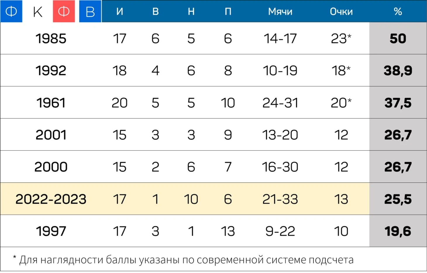 Стоит оговориться, что отрезки дистанции для сравнения получились различными: в случае с гладкими первенствами, мы брали первый круг (17 матчей в 1985 и 1997, 15 в 2000 и 2001), для первенств, проводившихся в два этапа - результаты первого из них (20 матчей в 1961, 18 матчей в 1992). А в РПЛ 2022-2023 контрольной отметкой стали 17 туров, проведённых командами до зимнего перерыва.